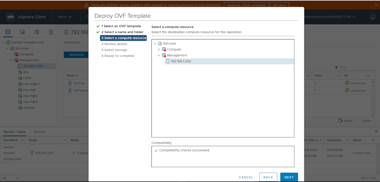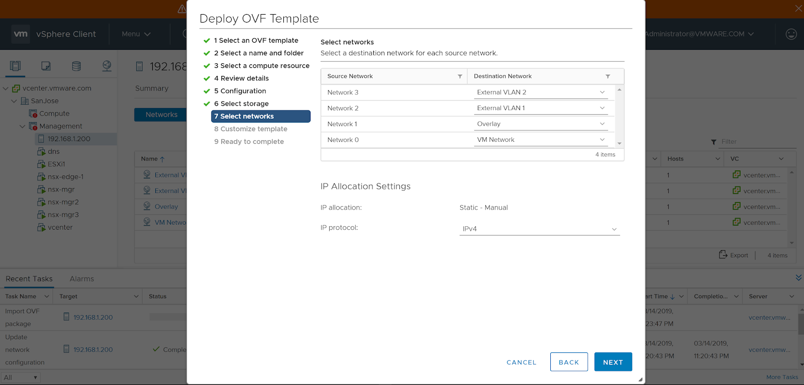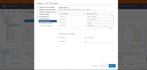 | Assign static IP address to management interface and select the Distributed Port Group (management) of VDS |