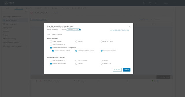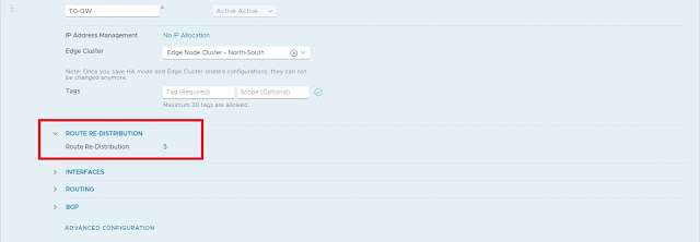 Configure redistribution on Tier 0 Gateways and Tier 1 Gateway