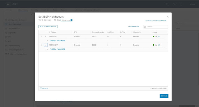 You will apply similar BGP configuration on the other Tier 0 Gateway Right but in that case the Local BGP AS number is 65002 as shown in the BGP topology above and the remote AS number will be same i.e. 65001