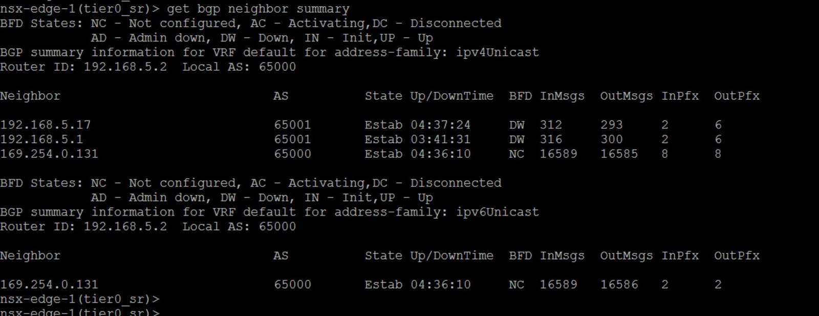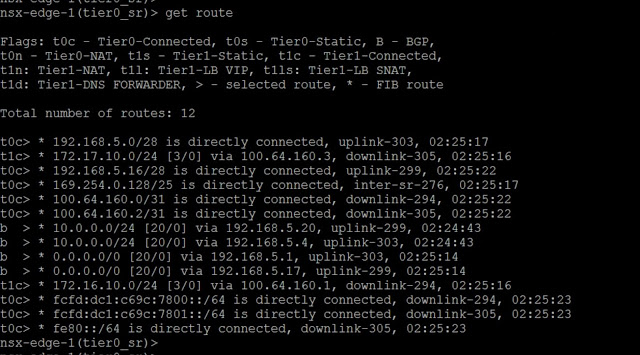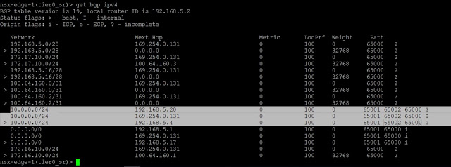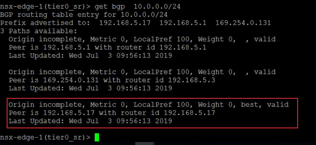 Let’s check how the route for 10.0.0.0/24 (which is locally connected to Tier 0 Gateway Right) is learnt by physical routers