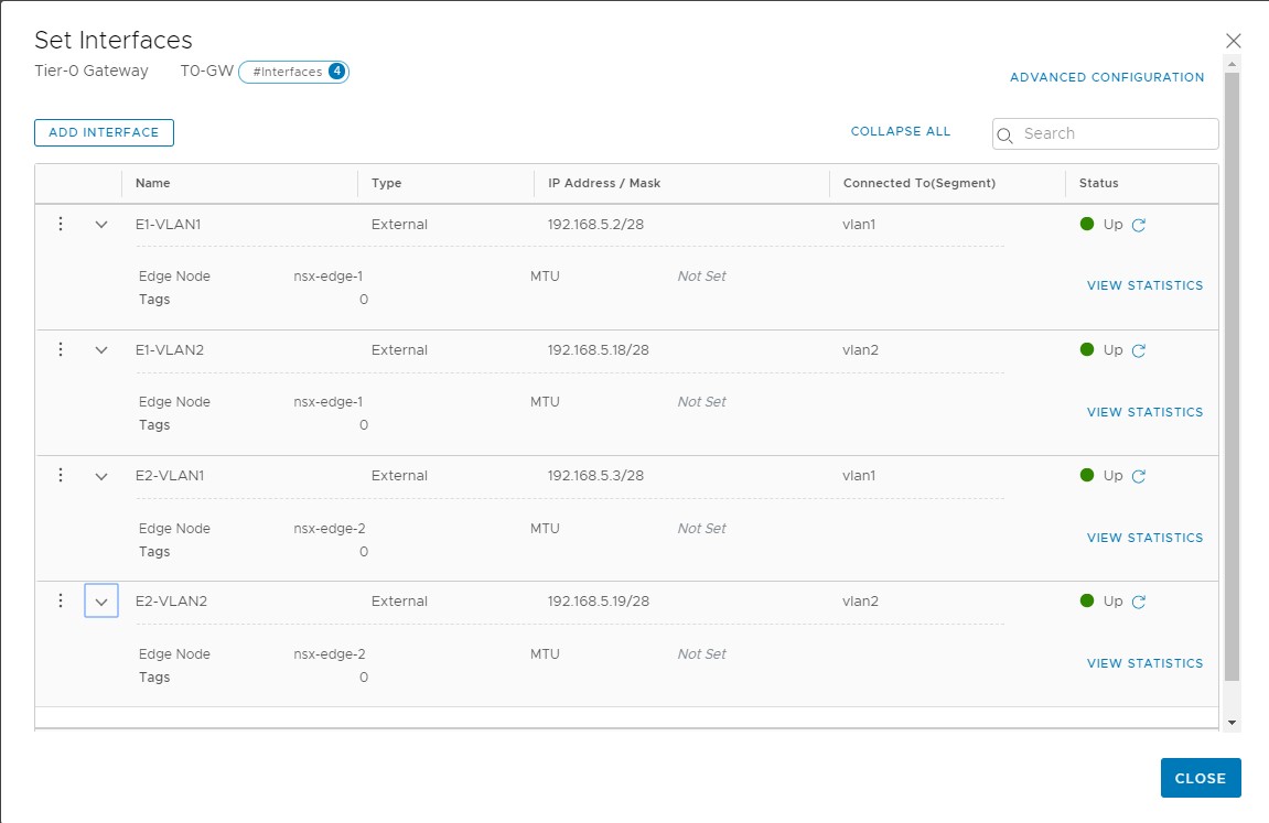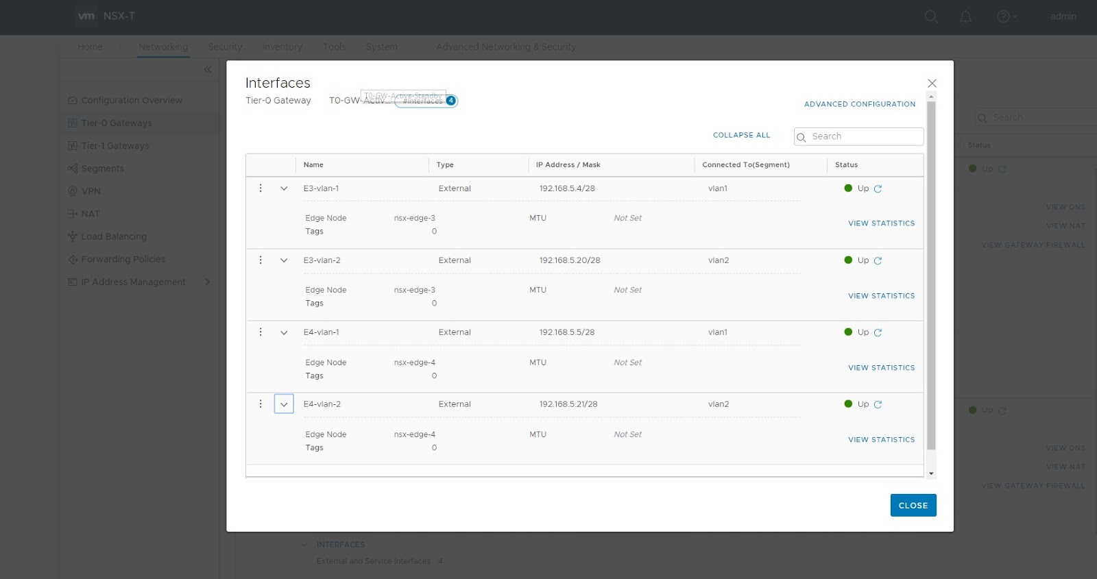 Below you find the interface configs applied on the Tier 0 Gateways.