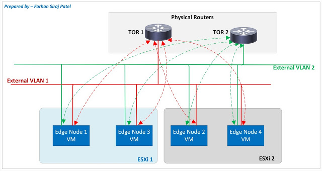 The above topology shows the e BGP peerings between NSX-T Edge Nodes and the physical routers.