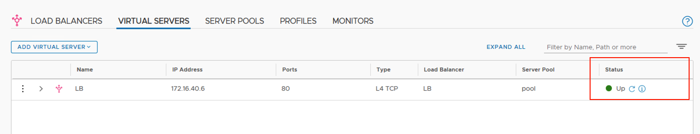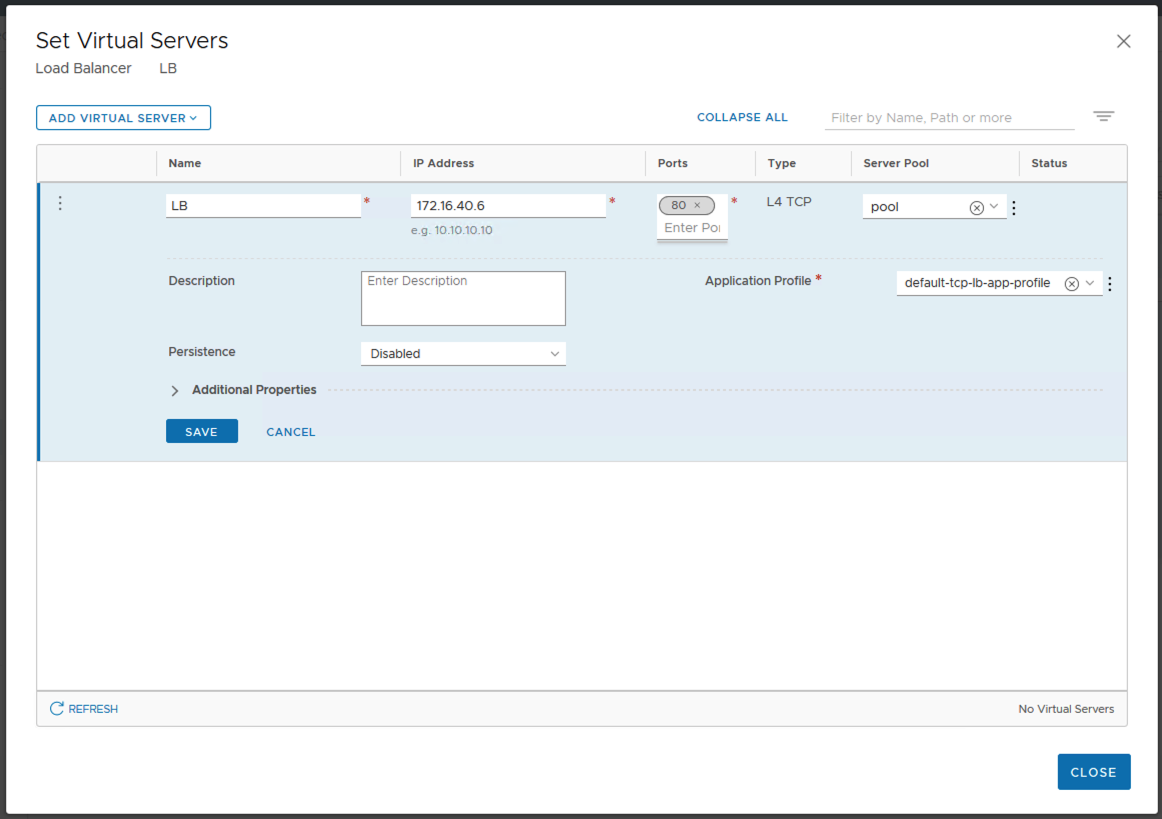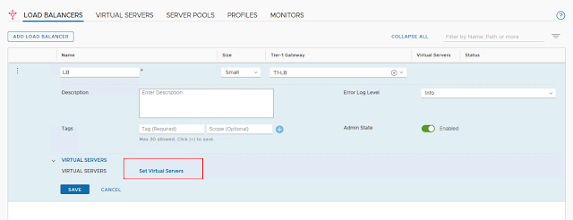 Next, create a load balancer and associate Tier 1 Gateway ‘T1-LB’ with this load balancer.