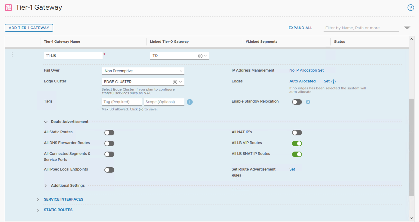 Also note that from route advertisement perspective, we are advertising LB VIP routes and LB SNAT IP Routes from this Tier 1 Gateway.