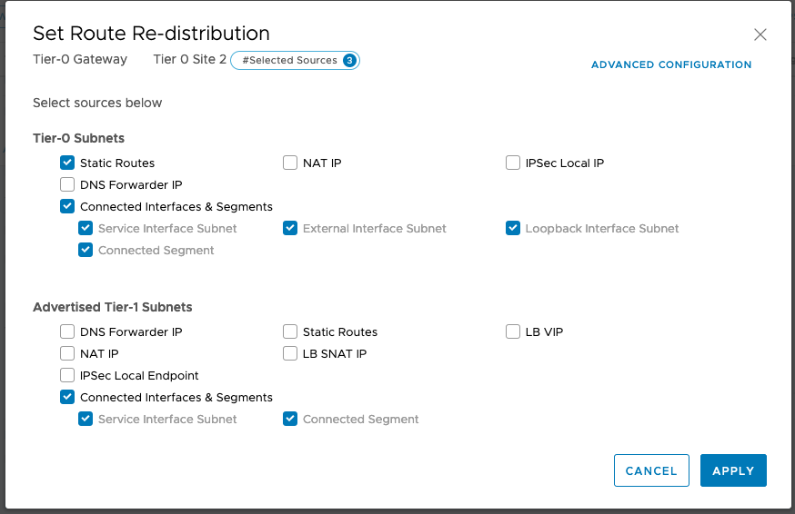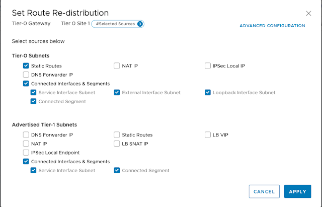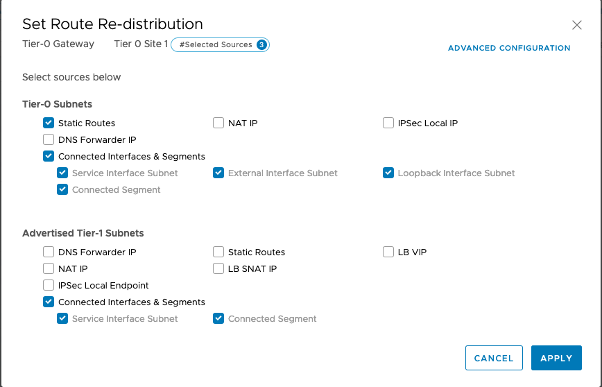 Enable route redistribution on Tier 0 Gateways to redistribute NSX routes into BGP