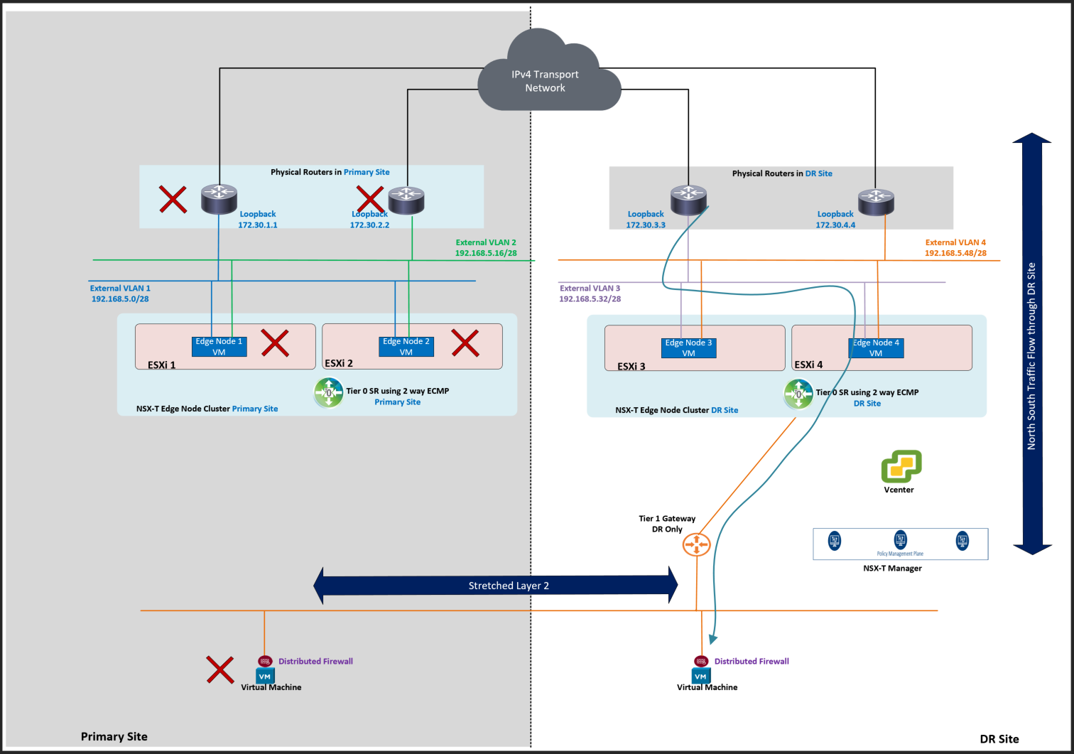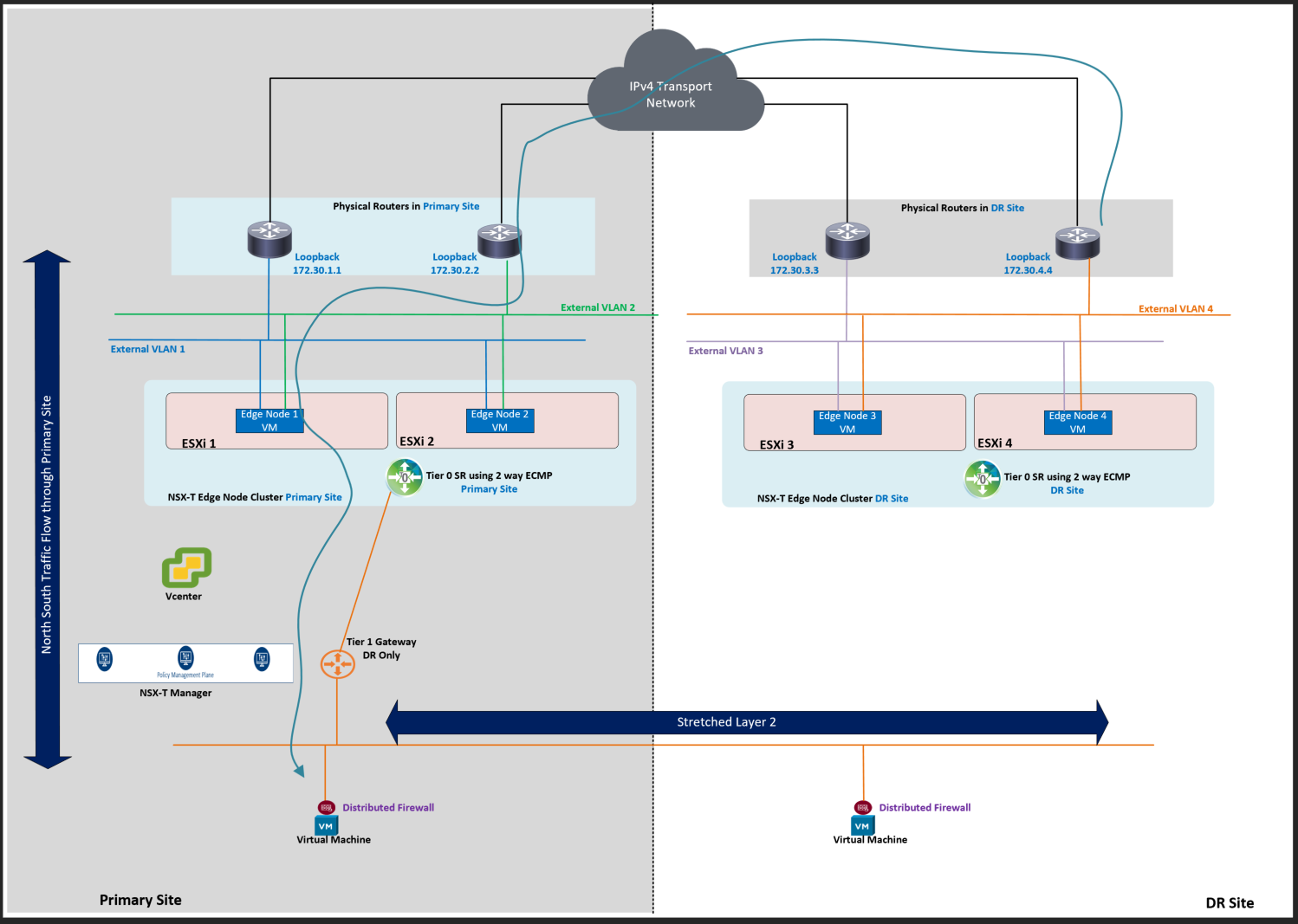 4. Management network in which the vcenter server and NSX-T managers reside is stretched across both the sites.