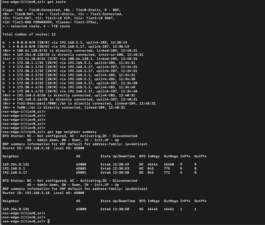 BGP peerings on Tier 0 SR of Edge Node 1 are up.
