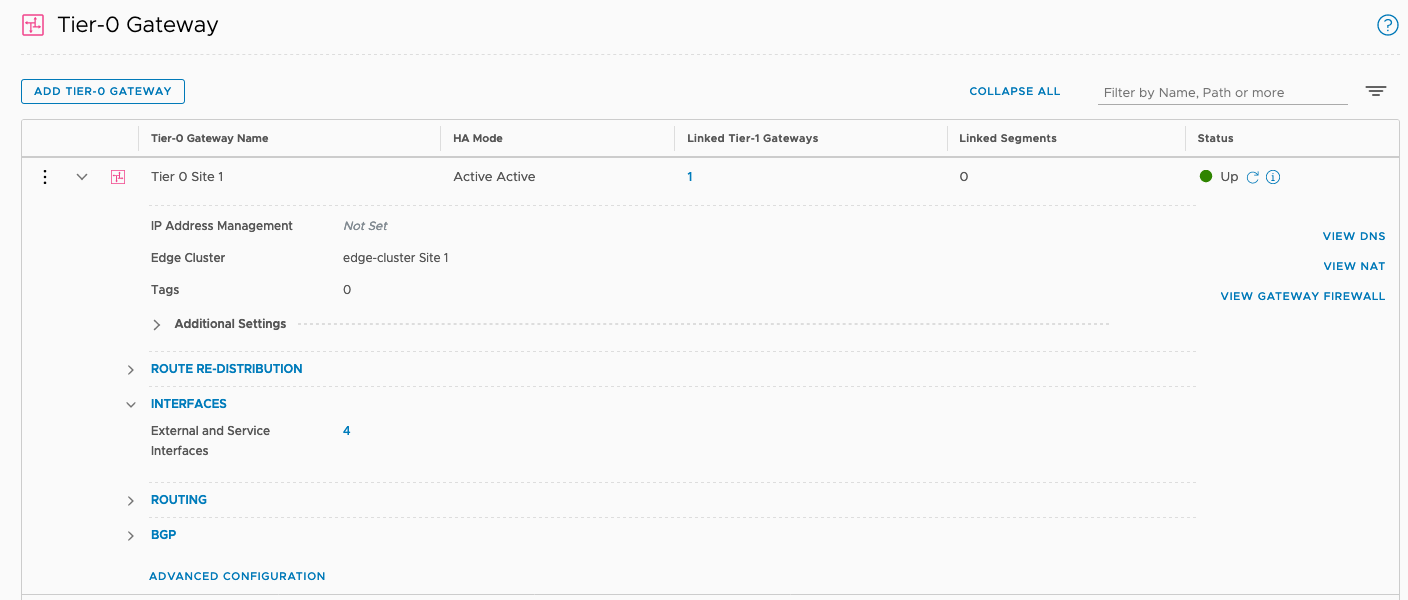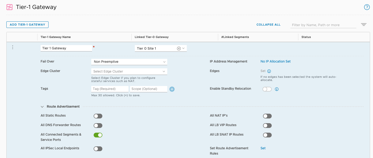 Tier 1 Gateway is connected to Tier 0 Gateway of Site 1.