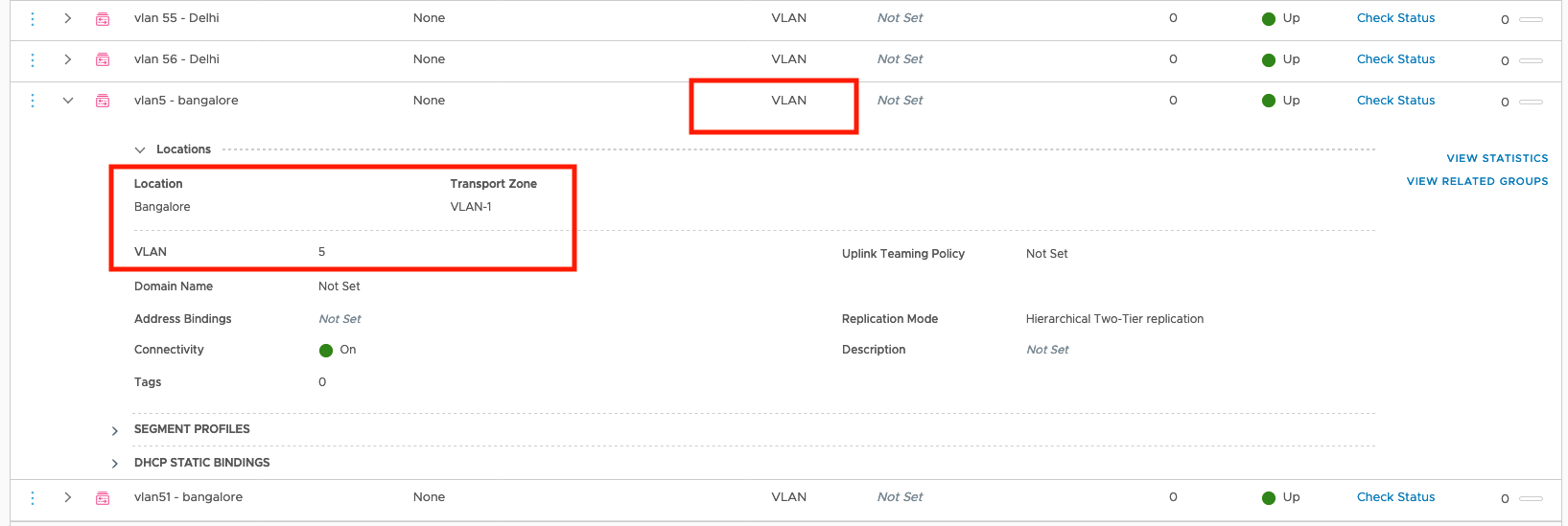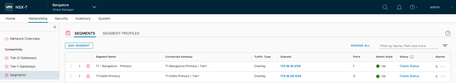 | Segments on Global Manager connected to Tier 1 Gateway |
