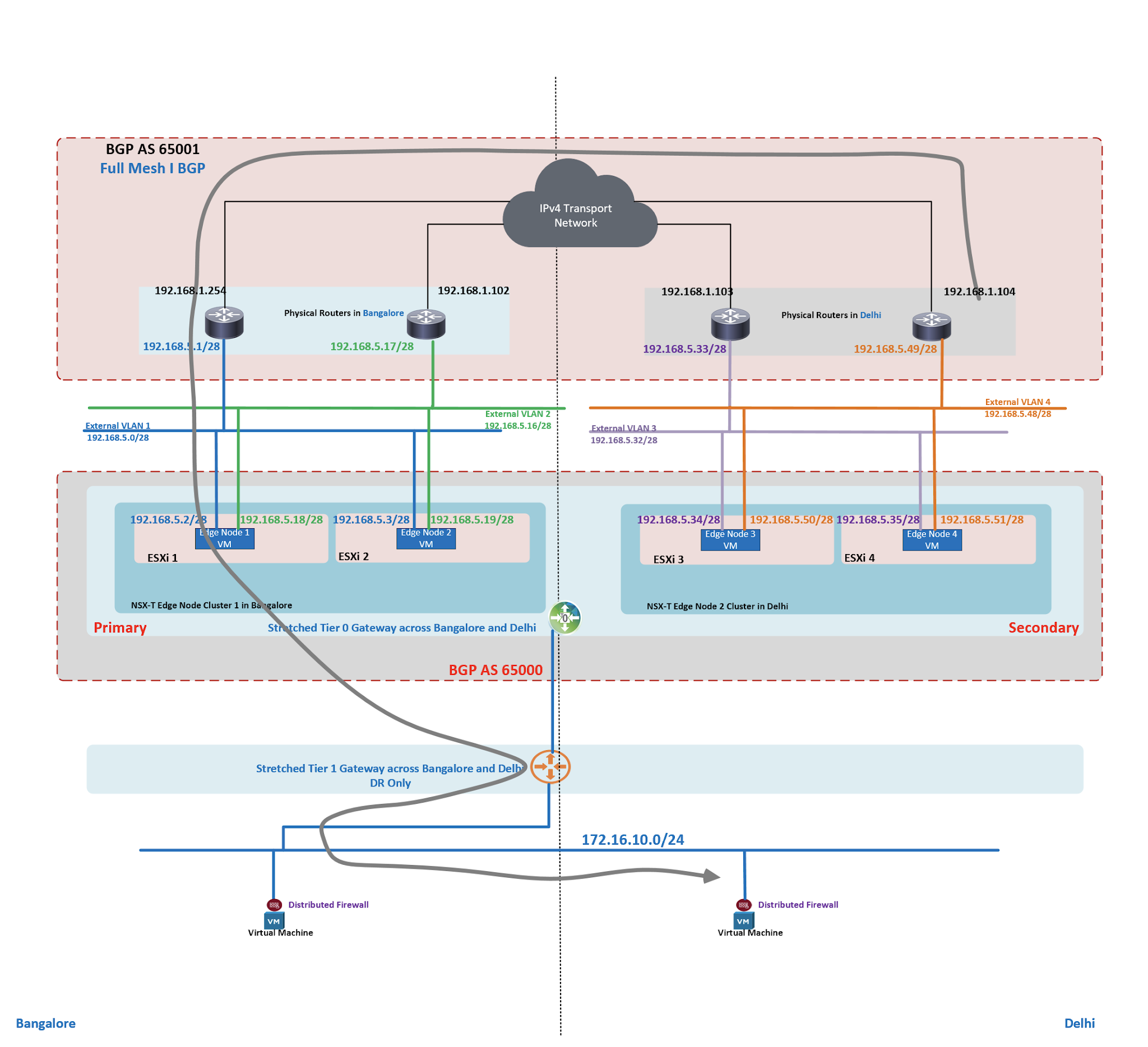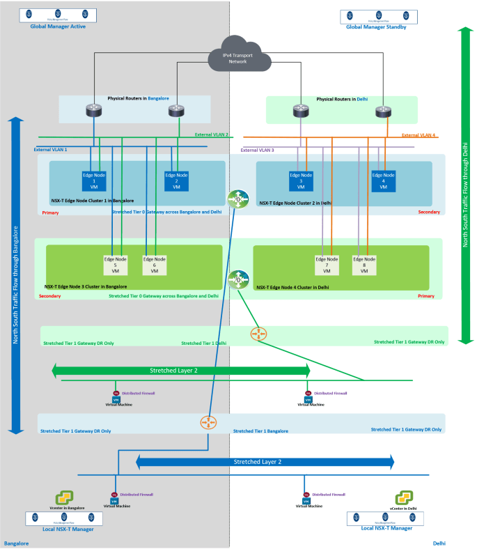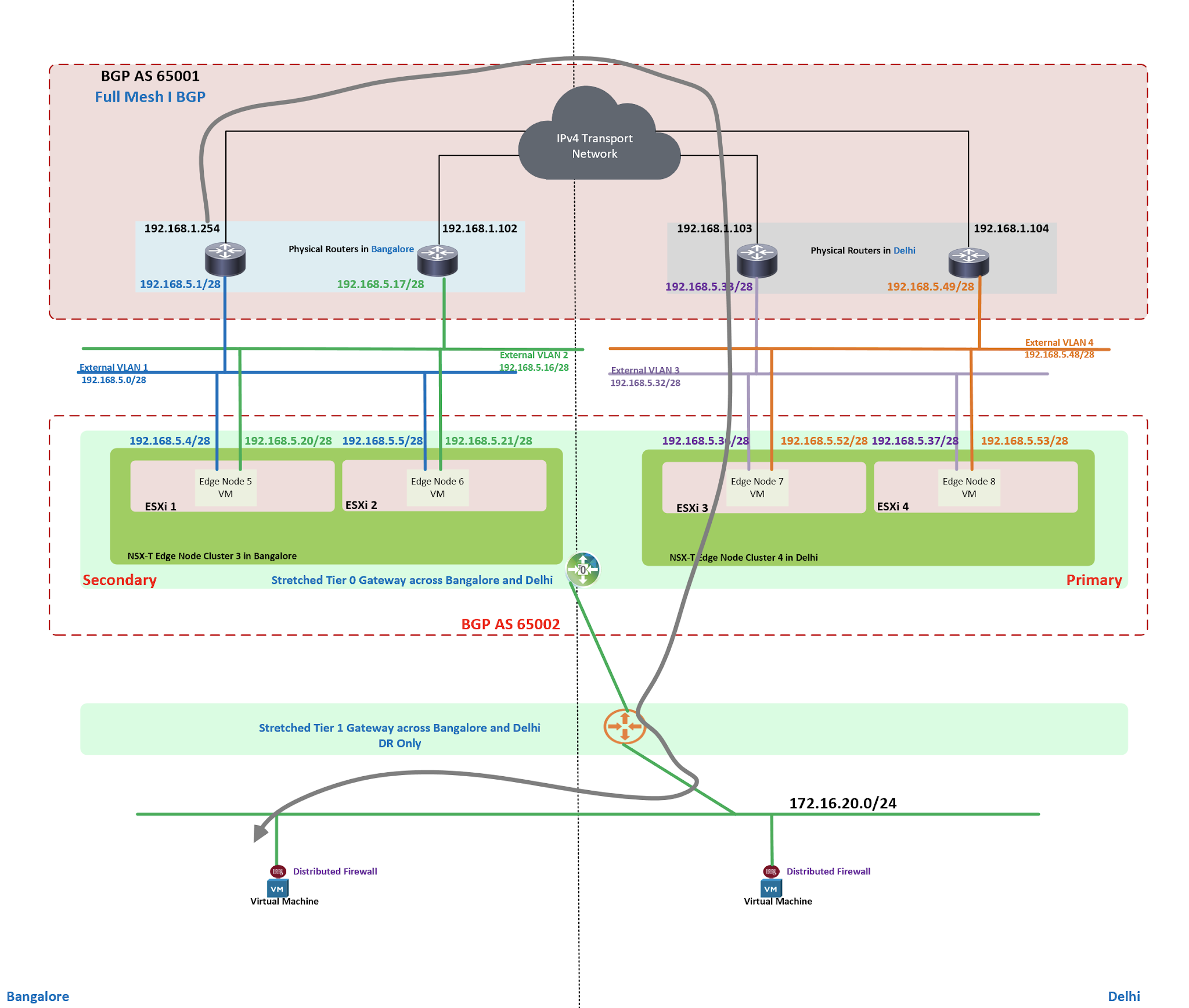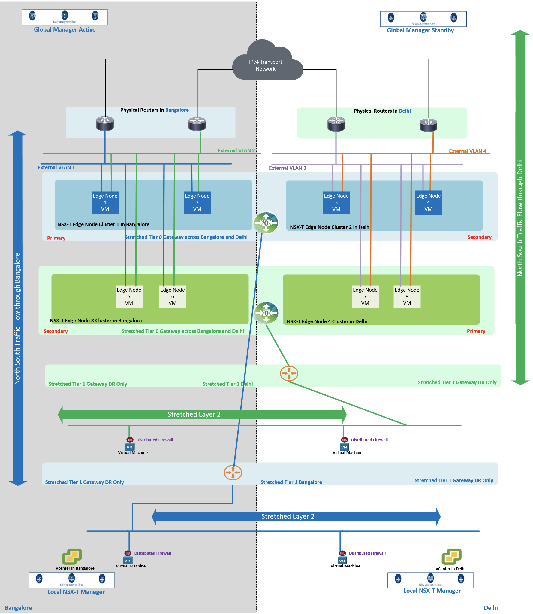 Traffic ingress and egress to/from subnet connected to Tier 1 Gateway Bangalore goes through physical routers in Bangalore.
