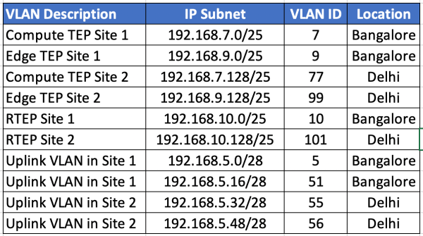 5. Each site has site local uplink VLANs, edge TEP VLAN, host TEP VLAN & RTEP VLAN
