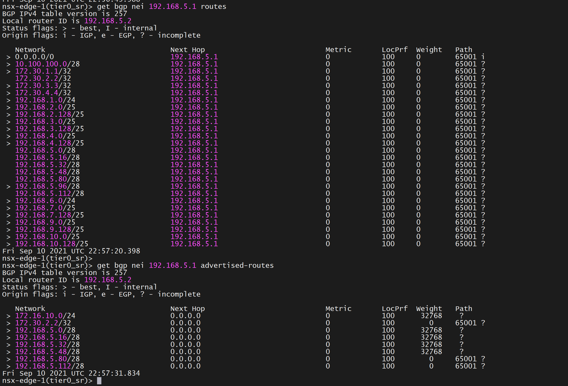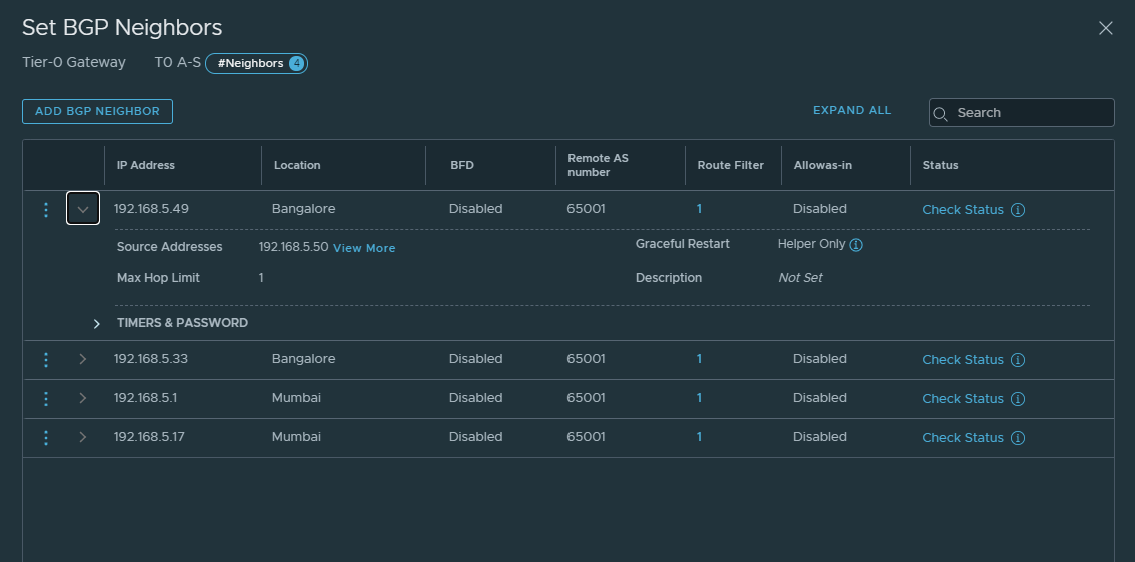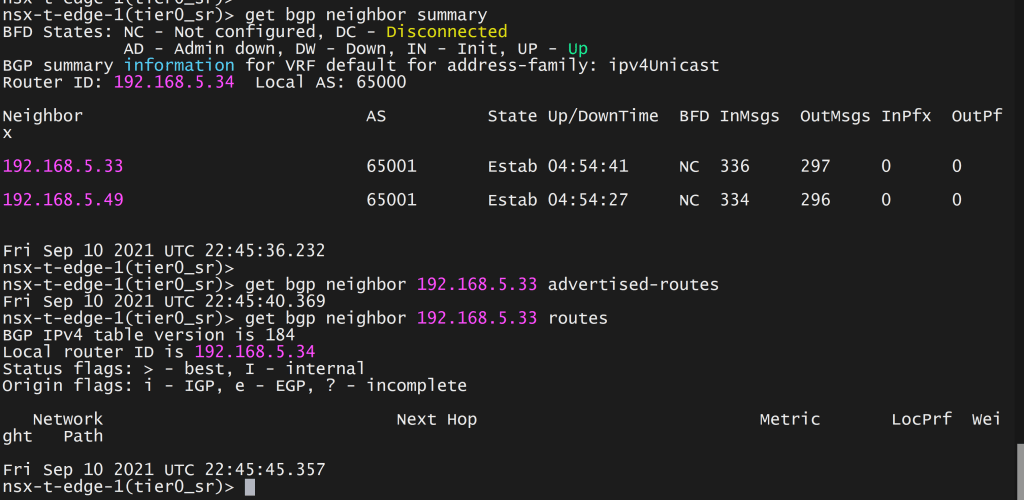 Now we will check BGP route learning on active edge in Mumbai location which is Primary location for the stretched Tier 0 Gateway.