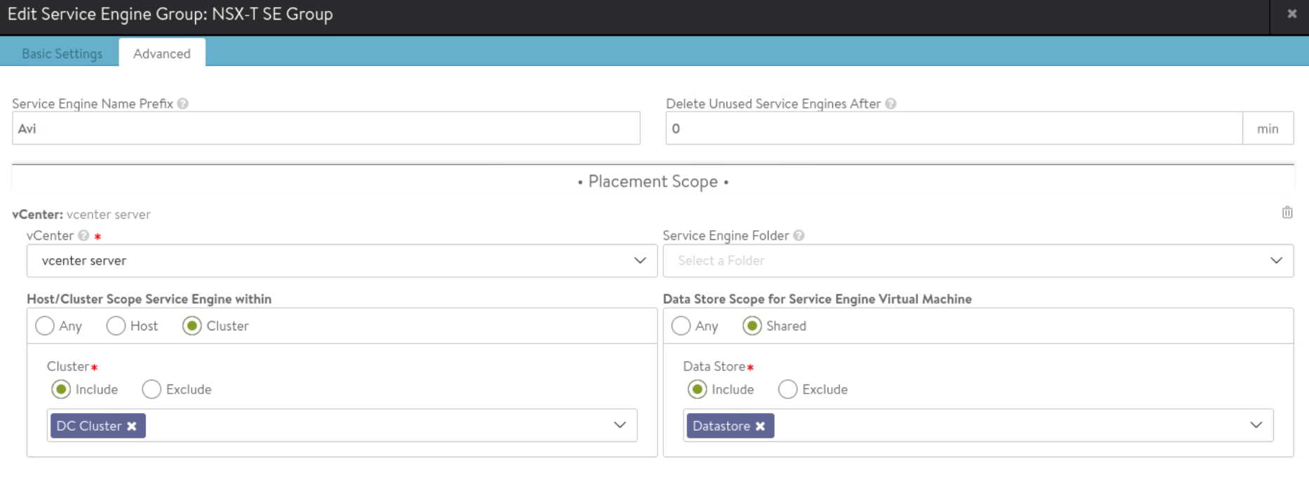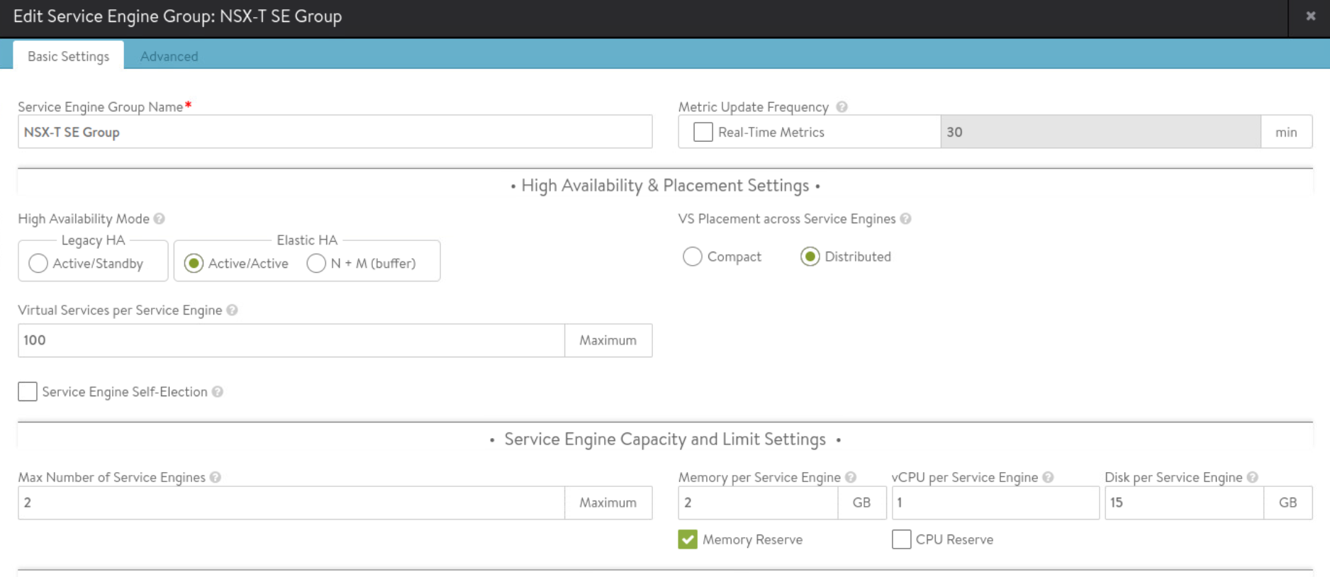 - Service Engine SE: is responsible for handling data traffic. Service engine provides data plane functions such as server load balancing, WAF, GSLB. A maximum of nine interfaces of this VM are available for data traffic with the first interface used for management purpose. Service engines are grouped in service engine groups and a particular virtual service can be placed on corresponding service engine group. Multiple service engine groups can be created on ALB controller to serve different environments, line of business. Number of vCPUs allocated to a deployed service engine will eventually consume NSX ALB license. Controller to service engine latency should be under 75 ms. High availability mode for the service engines is configured under SE group settings. Service engine resource allocation vCPU and memory has direct relationship with ALB performance. Several important parameters go into SE group settings: