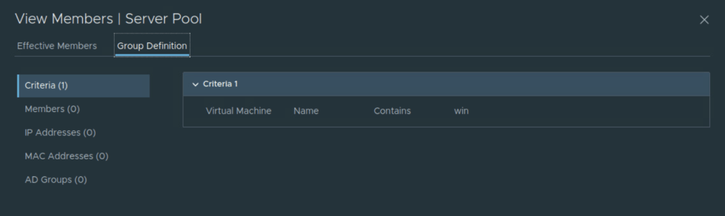 Before creating virtual service on NSX ALB Controller, I will create a dynamic security group in NSX-T based on VM name ‘win’. This security group will be used in server pool configuration of virtual service.