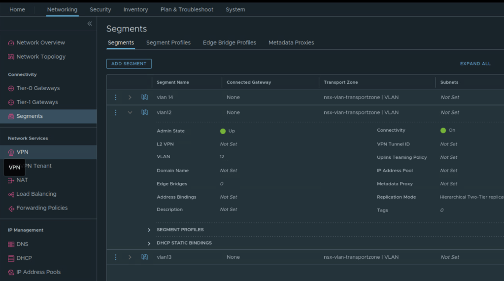 In this lab, I will be using NSX-T VLAN segments. Gateways for the subnets will reside on the physical routers.