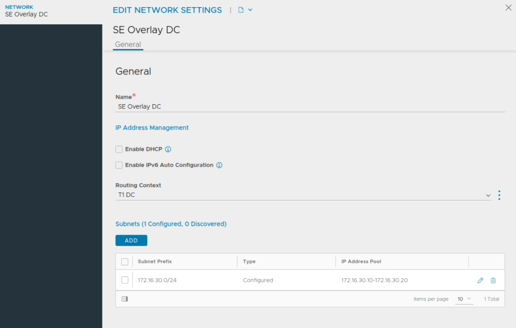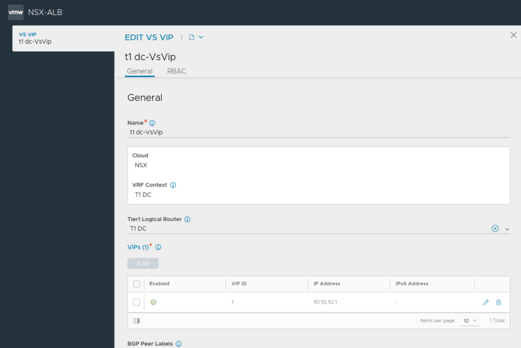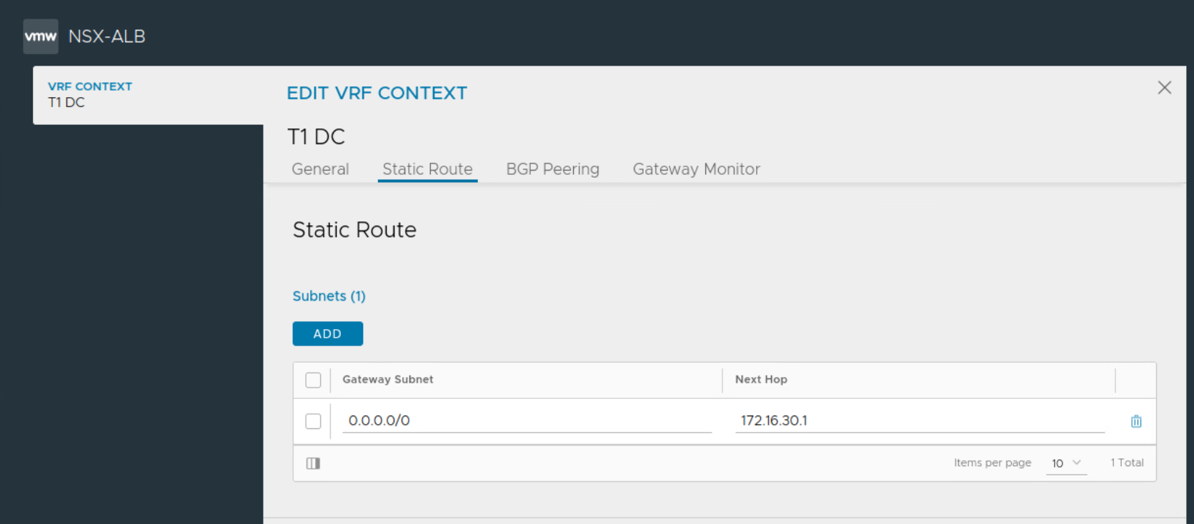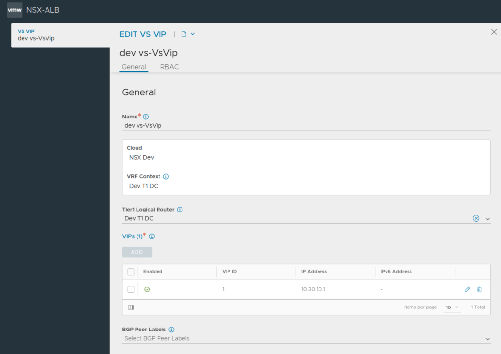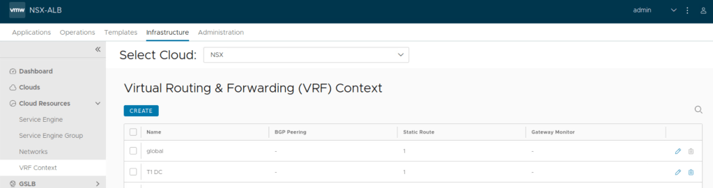 NSX ALB automatically creates a VRF context for every tier-1 gateway selected during VIP network configuration. This is done because the Segments connected to different Tier-1s can have the same subnet.