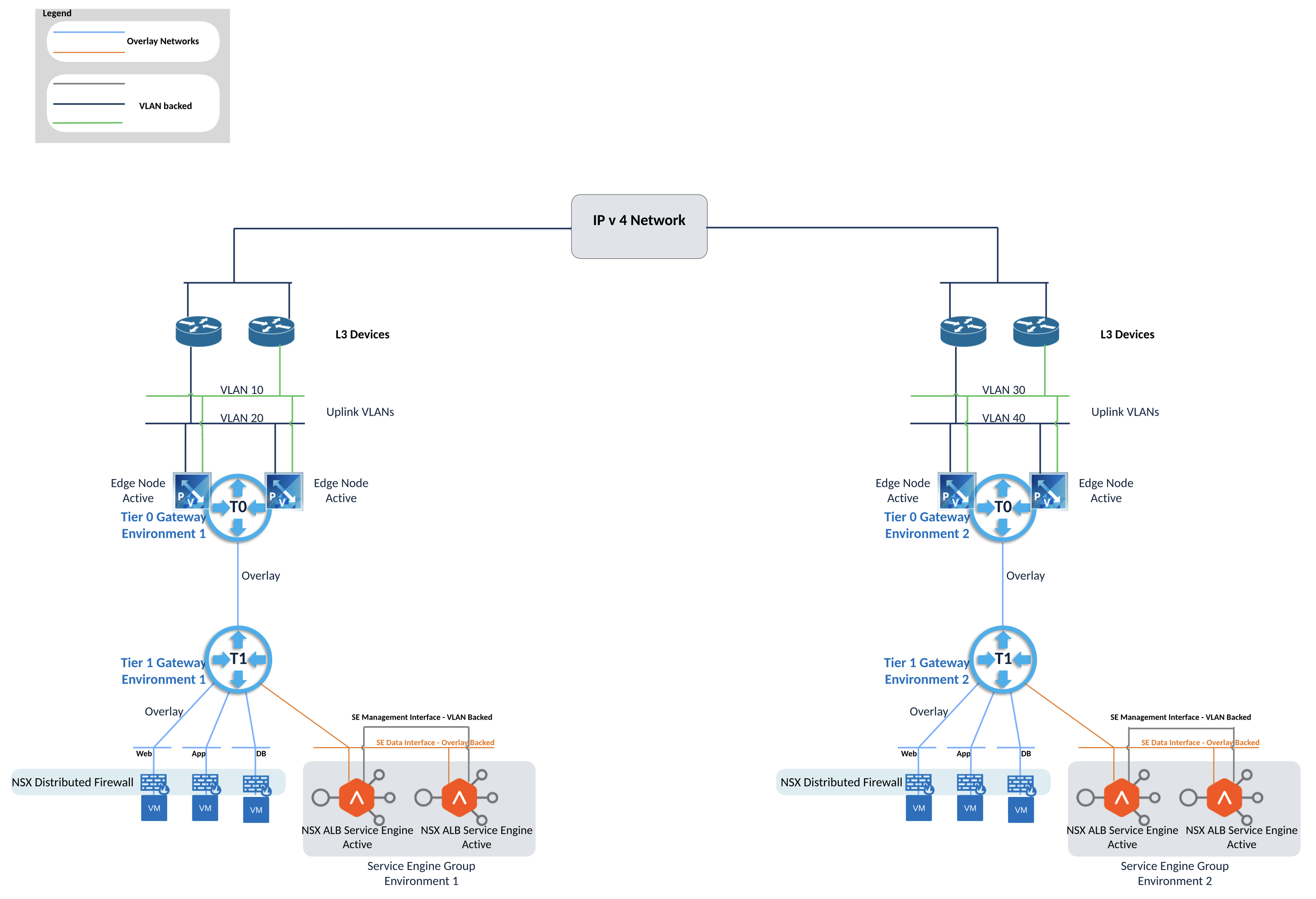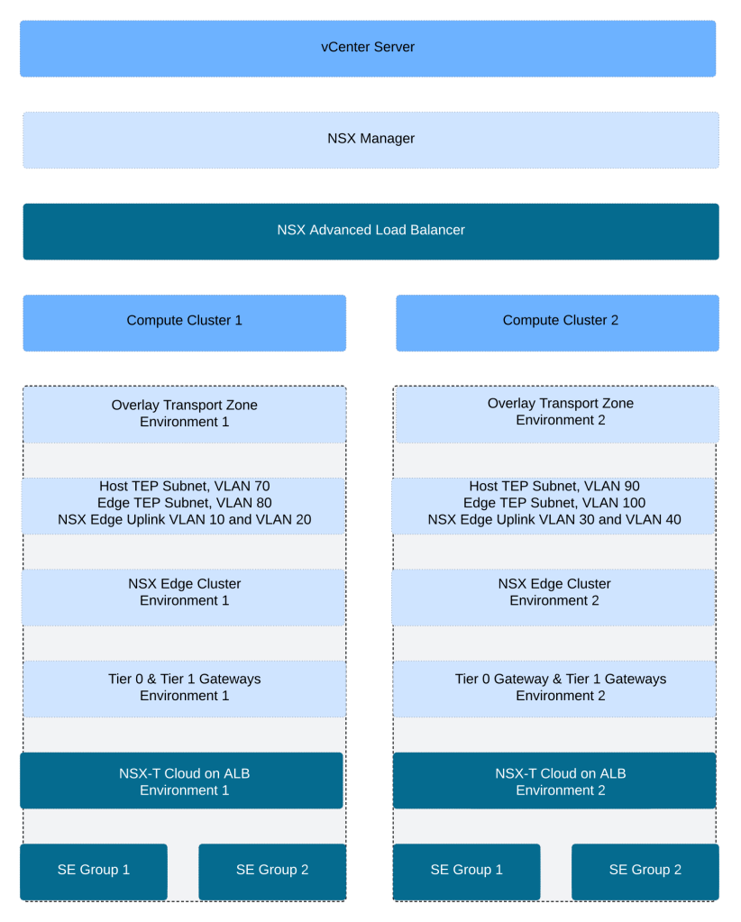 Dedicated physical L3 devices, NSX gateways and NSX ALB service engine groups are utilized for each environment, environment 1 is on the left hand side and environment 2 setup is on the right hand side.