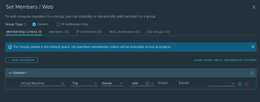 Next I will configure NSX security group based on NSX tag. Criteria is as shown below.
