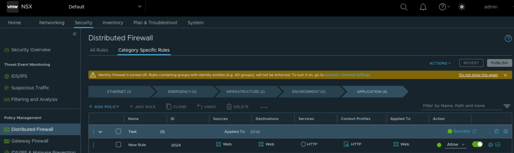 Here it is important to note that categories are evaluated from left to right (Ethernet > Emergency > Infrastructure > Environment > Application), and the distributed firewall rules within the category are evaluated in a top to down fashion.