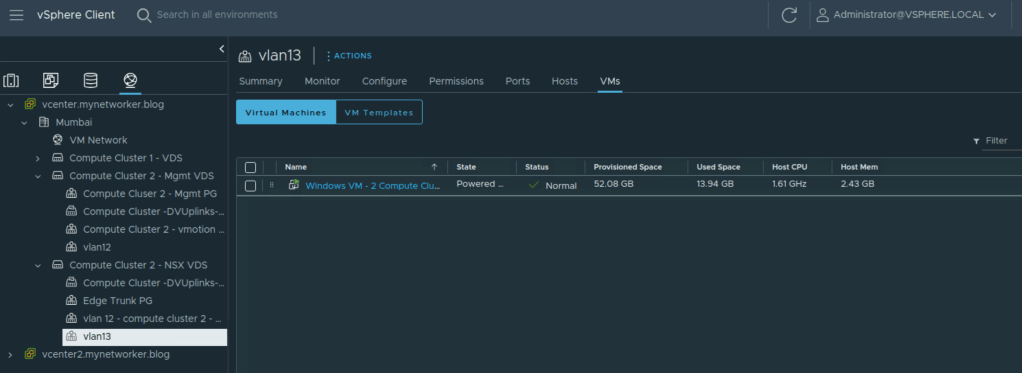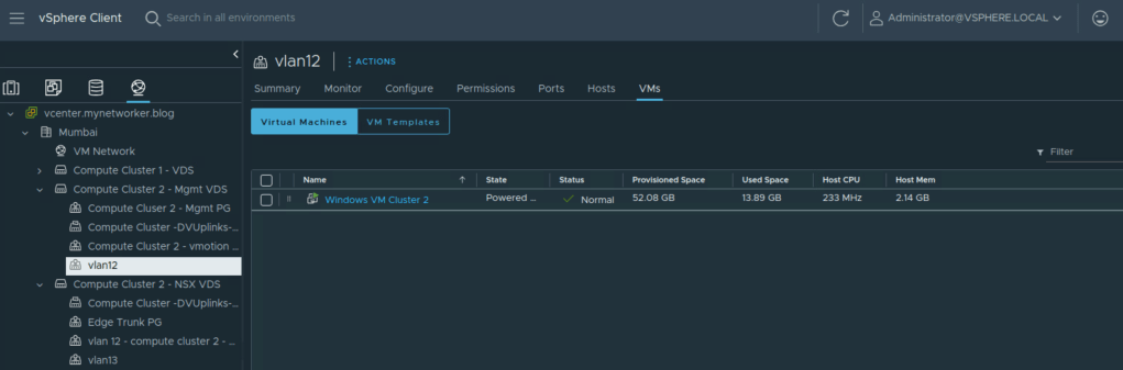 Next let’s ensure Virtual Machines are connected to appropriate distributed port groups. I have two subnets in my lab and I have configured the gateway on upstream L3 device. This deployment is not using NSX gateways (Tier 0/Tier 1) nor it is using overlay networks (SDN).