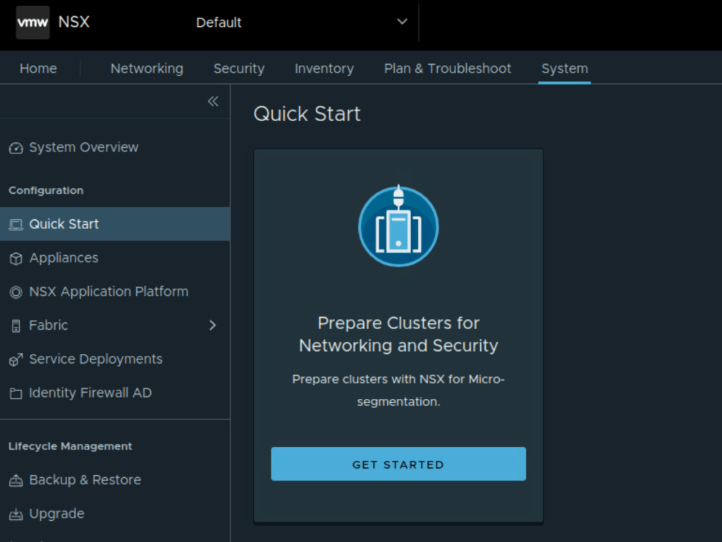 System – Quickstart – Prepare Clusters for Networking and Security – Select the cluster – Install NSX – Security Only