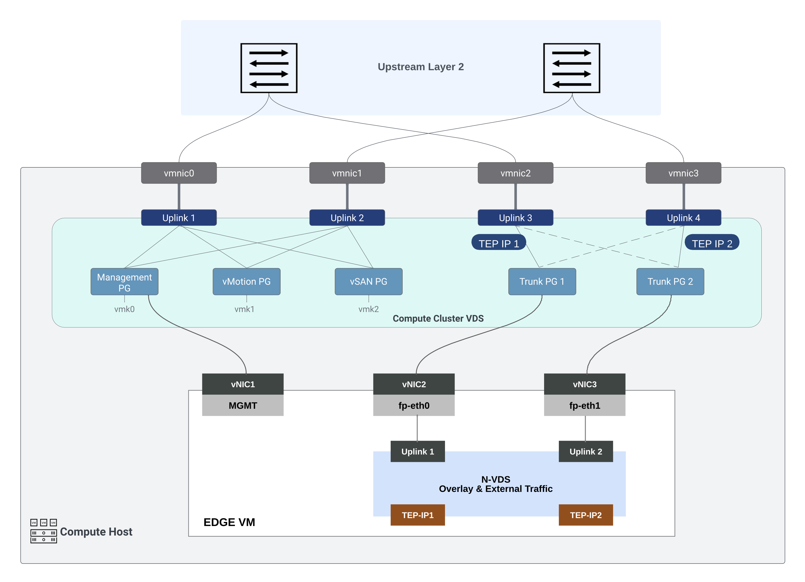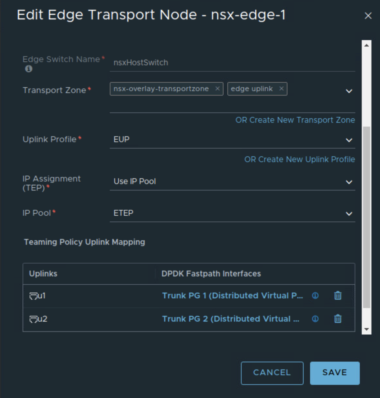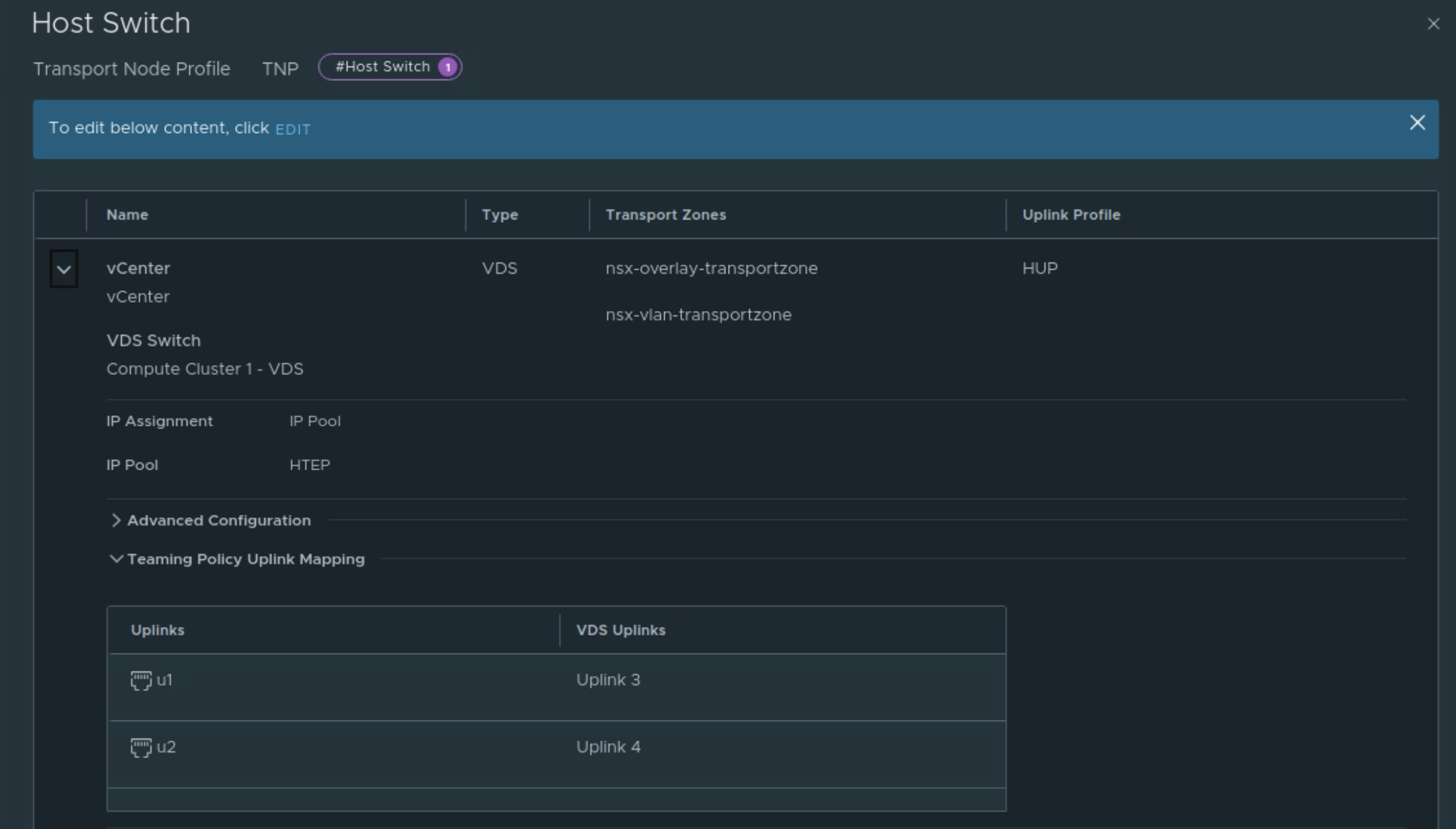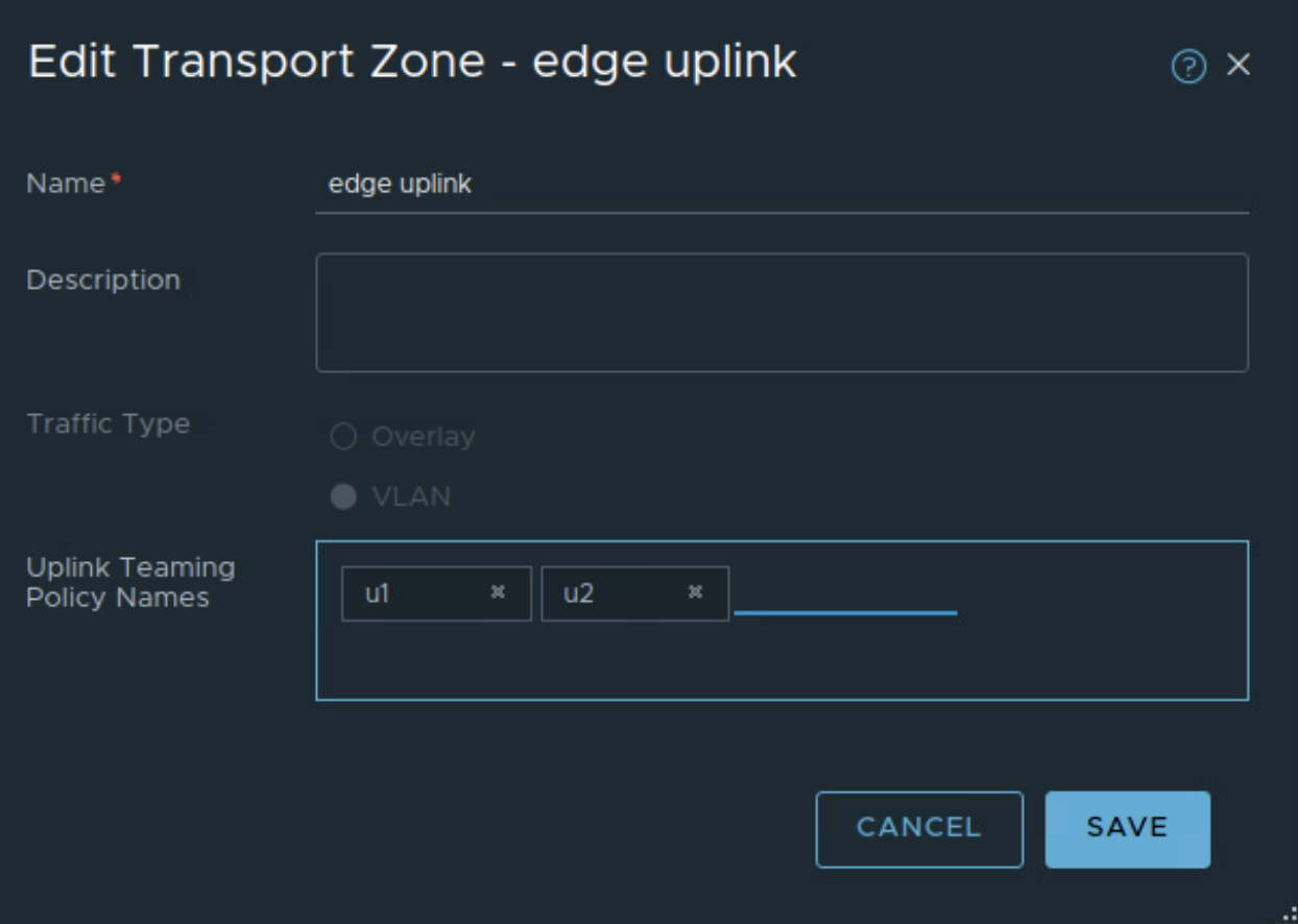 Named teaming policies will be used to pin VLAN traffic to appropriate trunk port group on upstream VDS. Edge uplink profile is created with appropriate VLAN ID corresponding to edge overlay traffic and with named teaming policies. u1 and u2 in figure below are additional named teaming policies.