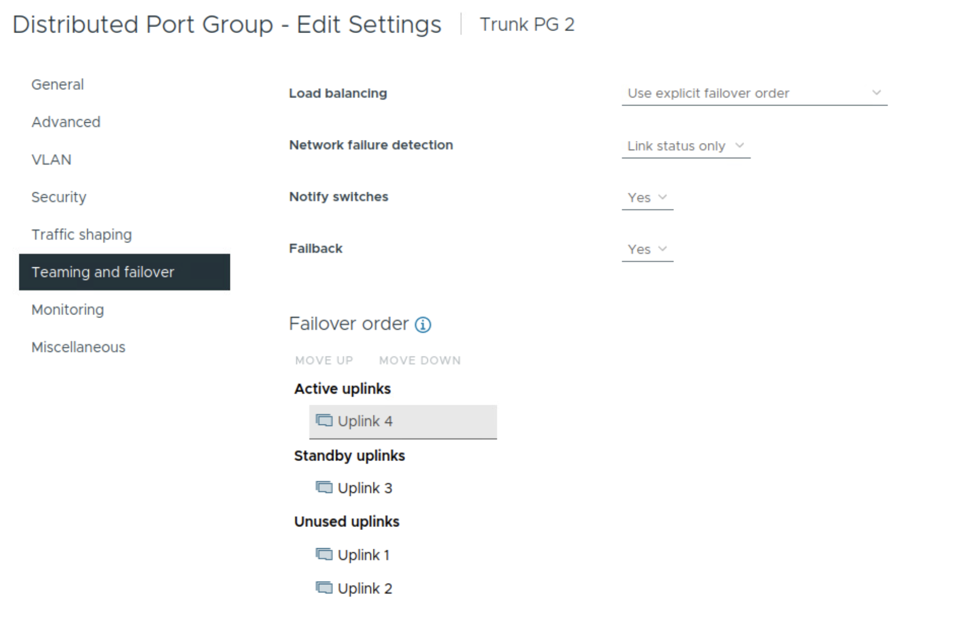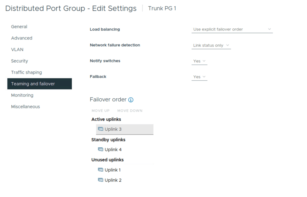 This NSX edge is connected to trunk port groups on upstream VDS with the teaming policies as below