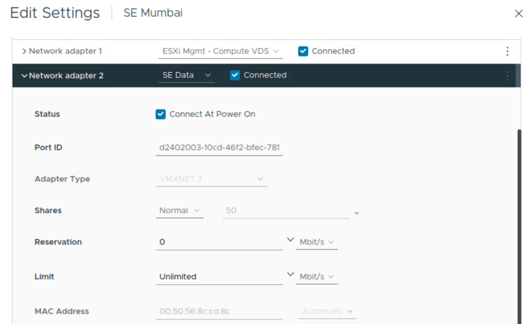 Fetch the mac address of data interface vnic on the service engine from vSphere client. This will be useful while configuring IP addressing on service engine data interface. Notice below that the mac address ends with cd8c