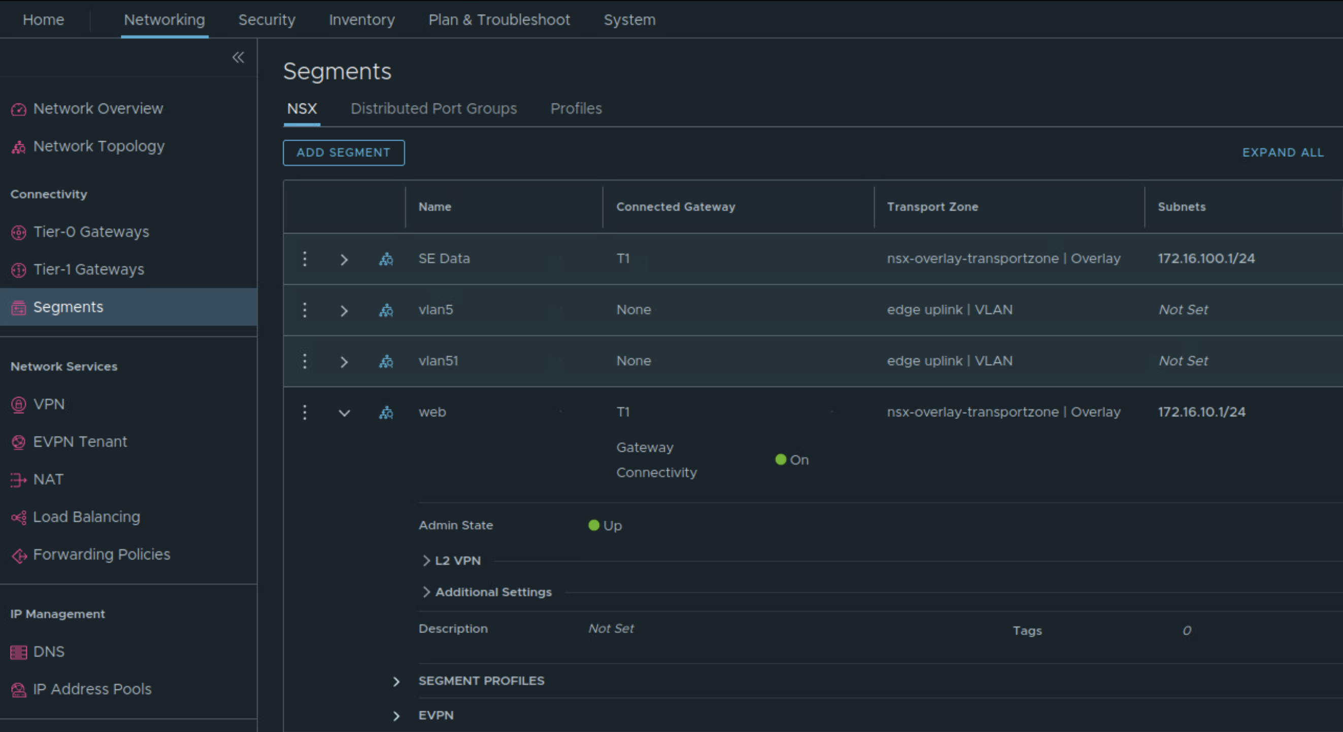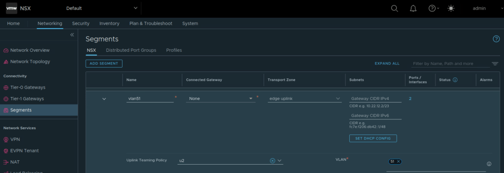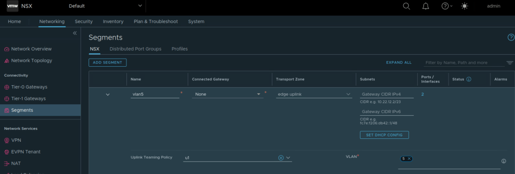Tier 0 Gateway needs uplink segments, so those need to be created. Here the named teaming policy is referenced while creating VLAN segment for edge uplink.