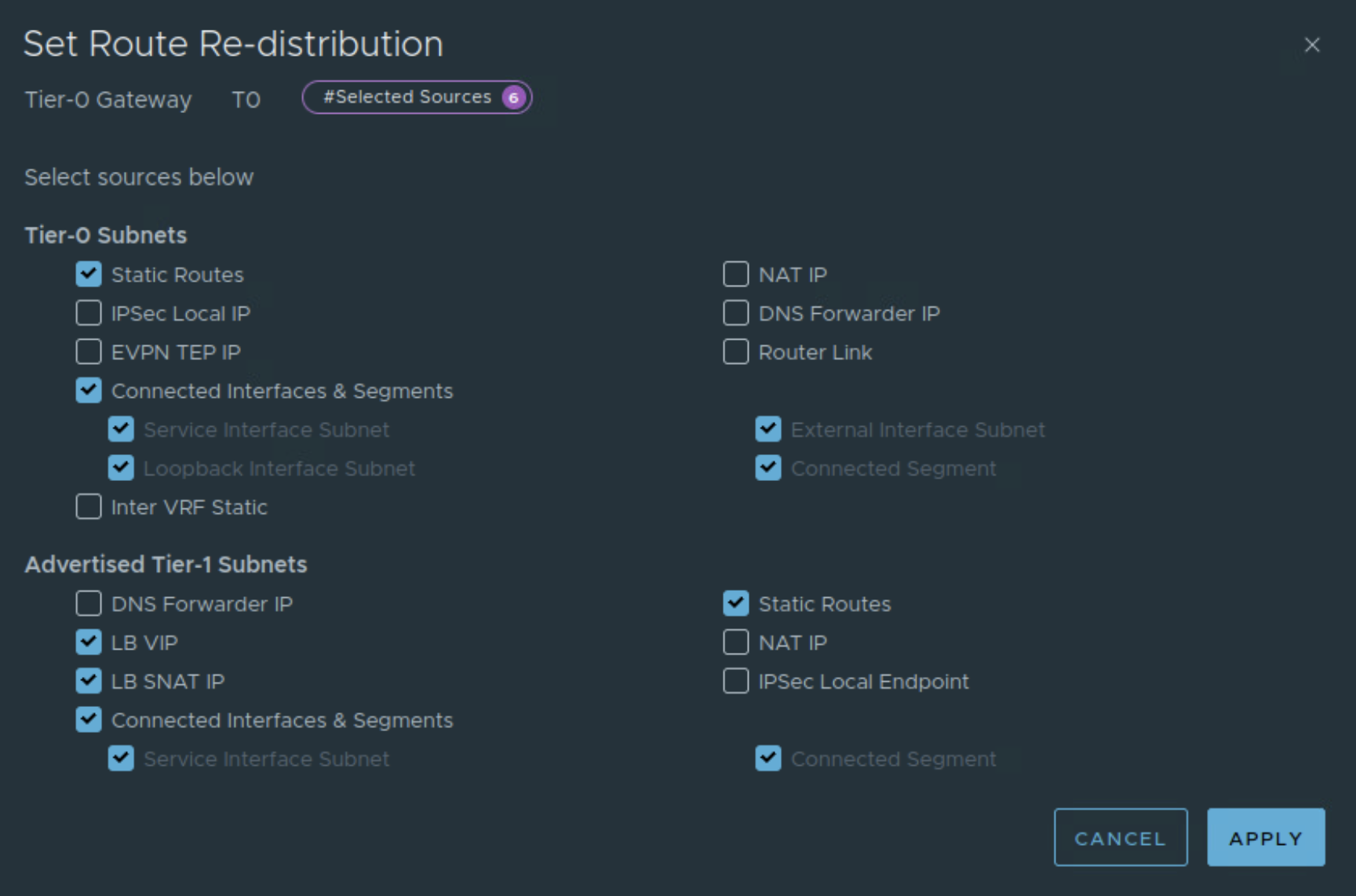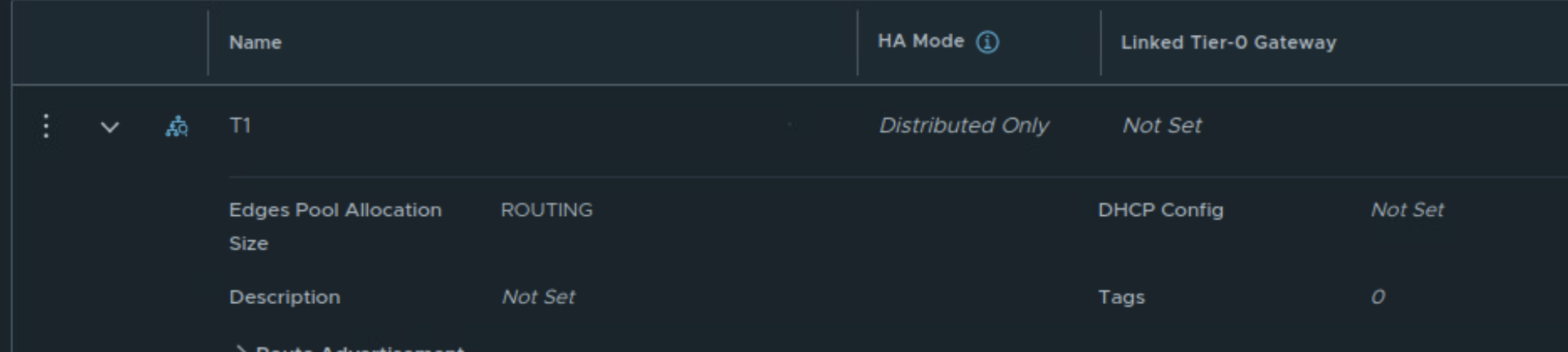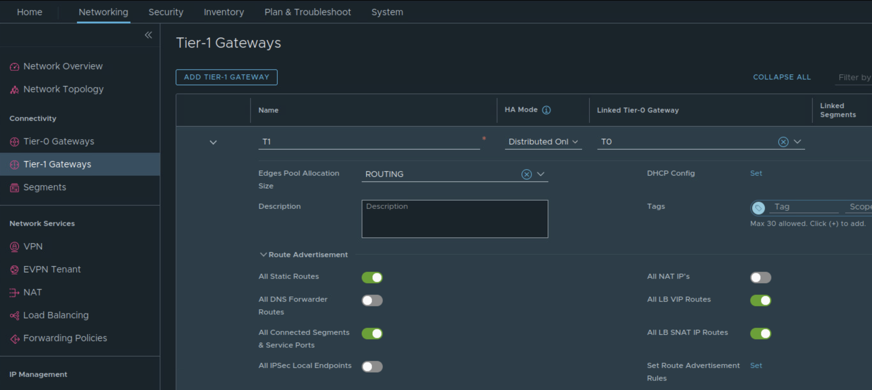 Connect Tier 1 Gateway to upstream Tier 0 Gateway and advertise NSX routes