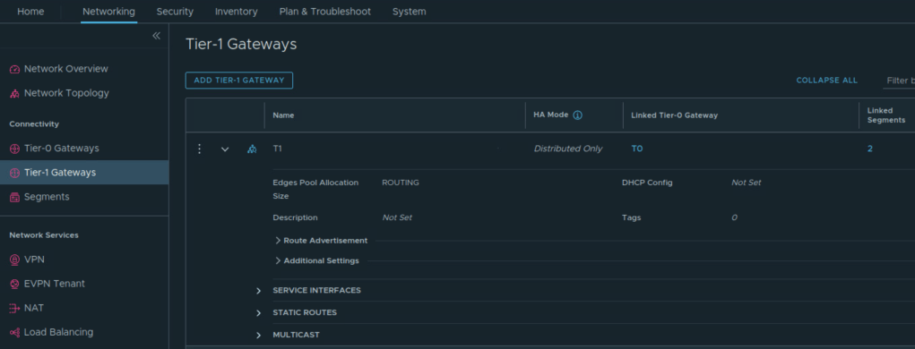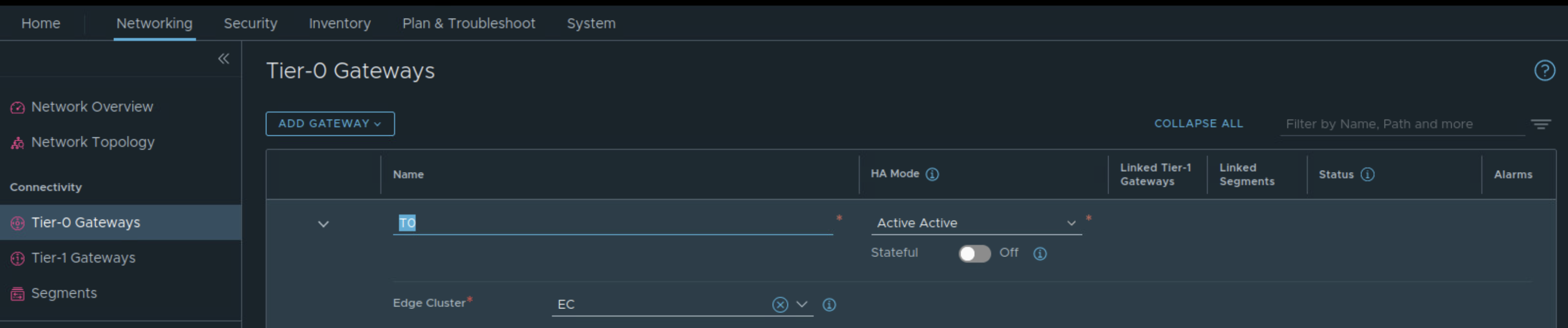 Create Tier 0 Gateway in Active-Active availability mode, map the edge cluster created earlier on this Tier 0 Gateway.