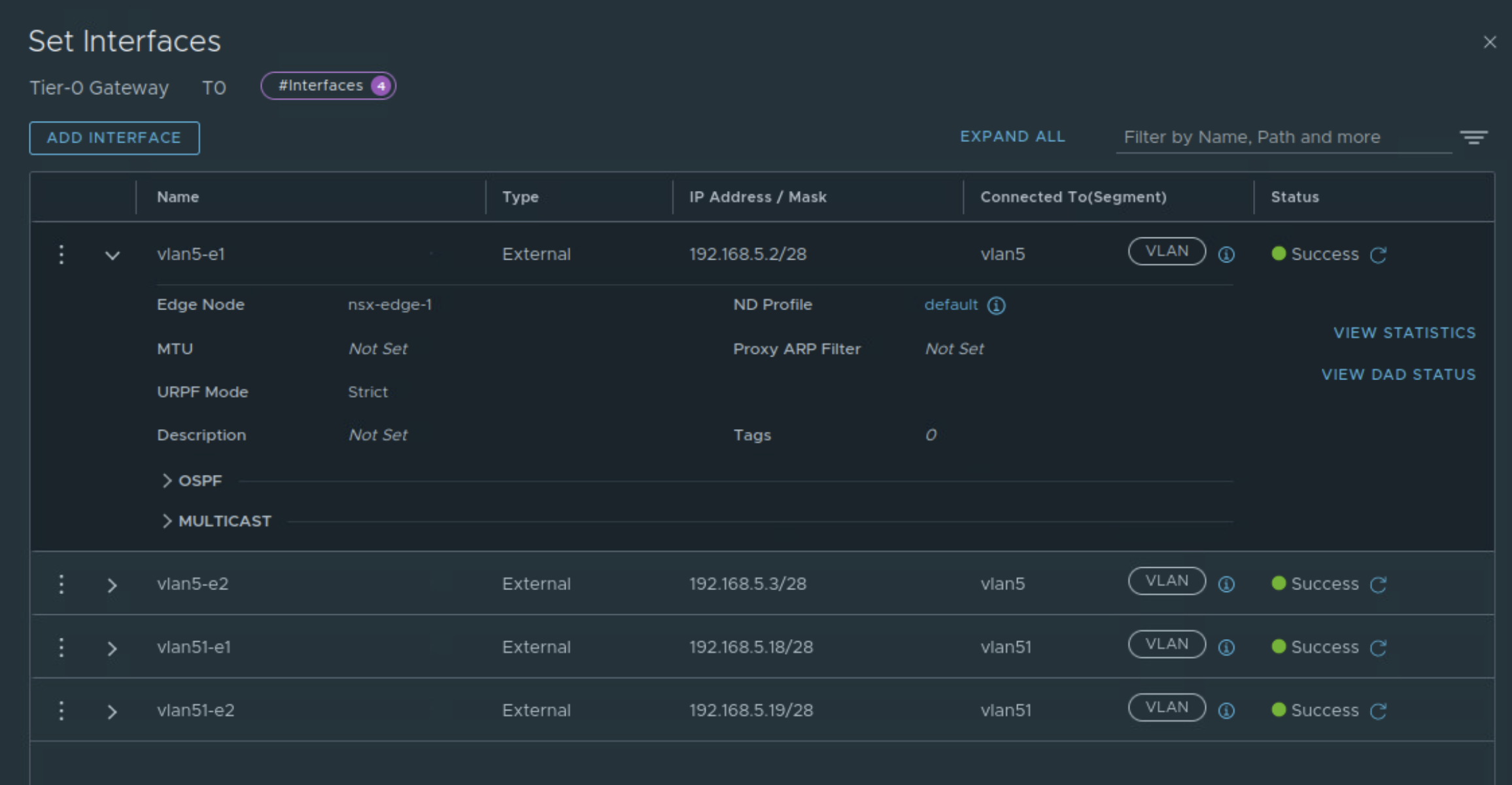 While creating interfaces on Tier 0 Gateway, appropriate VLAN segments are referenced (those with named teaming policy).