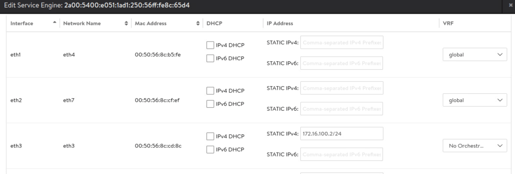 Next I will configure IP address on data interface of service engine based on the MAC address of the interface and I will ensure that the interface belongs to the newly created VRF.