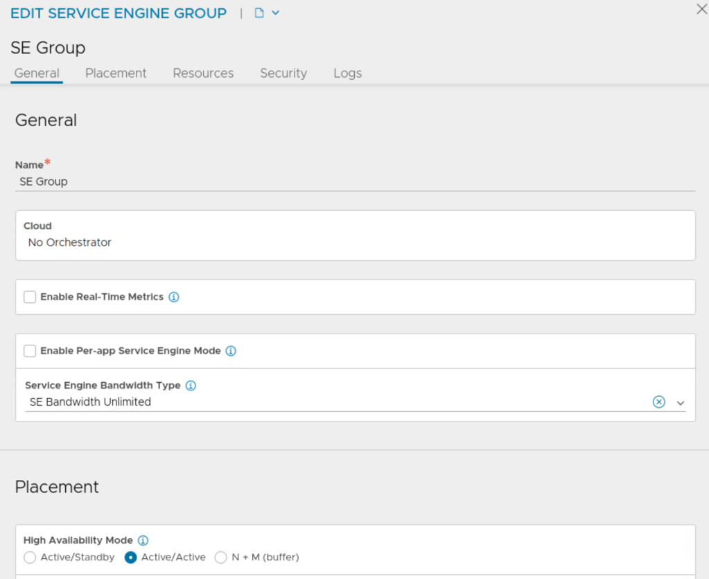 - Service Engine SE: is responsible for handling data traffic. Service engine provides data plane functions such as server load balancing, WAF, GSLB. A maximum of nine interfaces of this VM are available for data traffic with the first interface used for management purpose. Service engines are grouped in service engine groups and a particular virtual service can be placed on corresponding service engine group. Multiple service engine groups can be created on ALB controller to serve different environments, line of business. Number of vCPUs allocated to a deployed service engine will eventually consume NSX ALB license. Controller to service engine latency should be under 75 ms. High availability mode for the service engines is configured under SE group settings. Service engine resource allocation vCPU and memory has direct relationship with ALB performance. Several important parameters go into SE group settings: