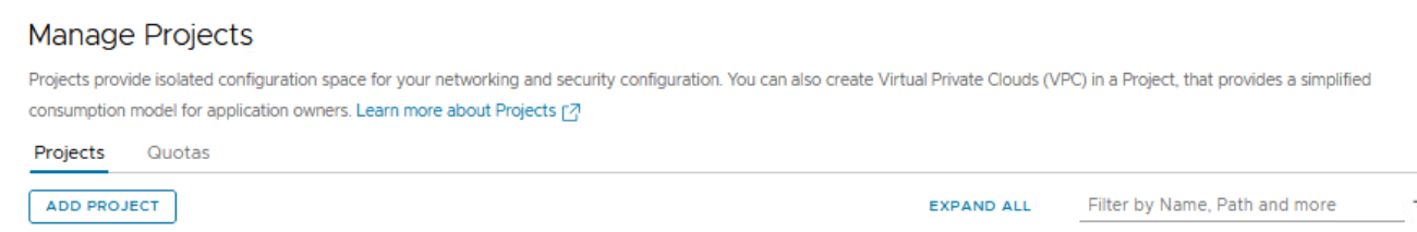 From the landing page of NSX Manager UI, navigate to Projects | Manage