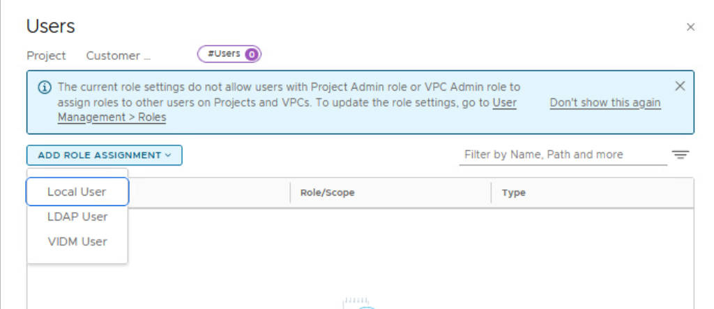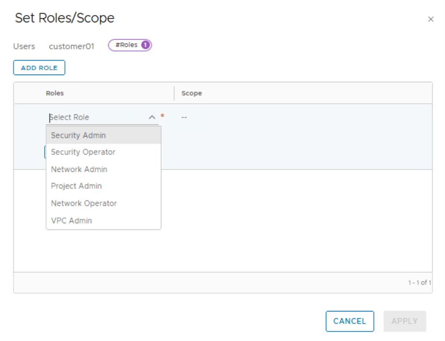 Users that are assigned the VPC Admin role or the Network Admin role in the NSX VPC can add subnets in the NSX VPC. In addition to these two roles, an NSX VPC can also have the following user roles, but with their scope confined to the NSX VPC: