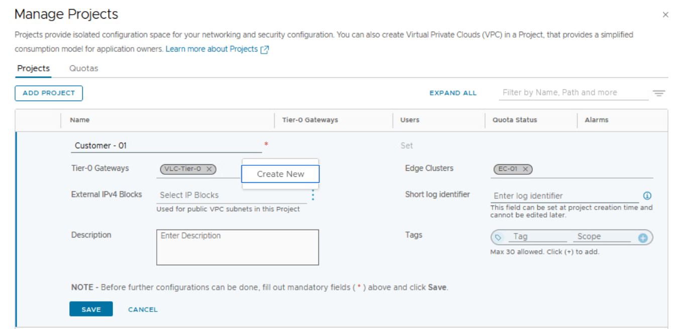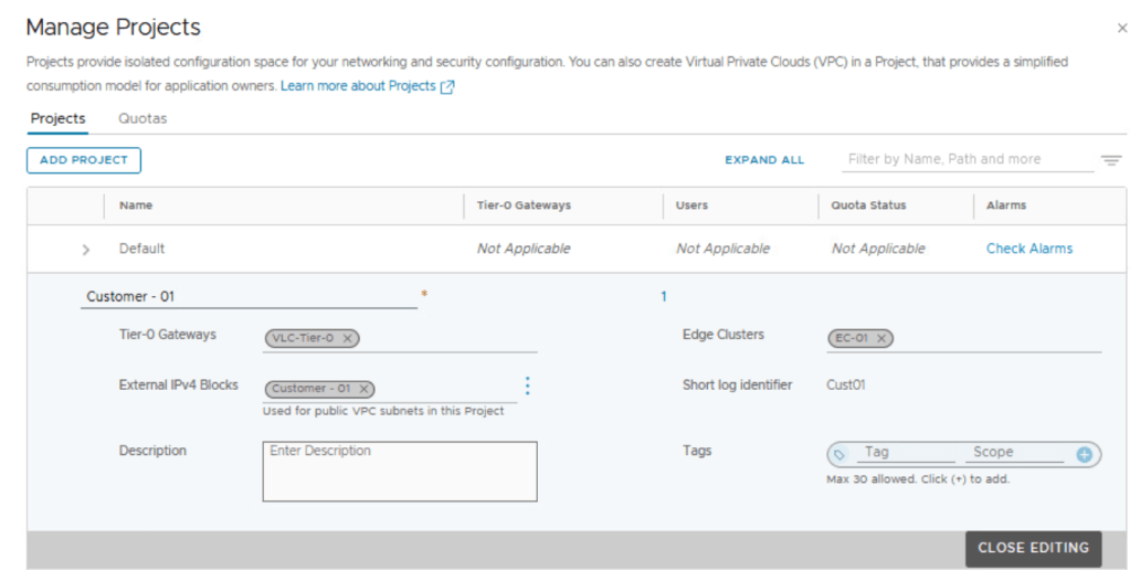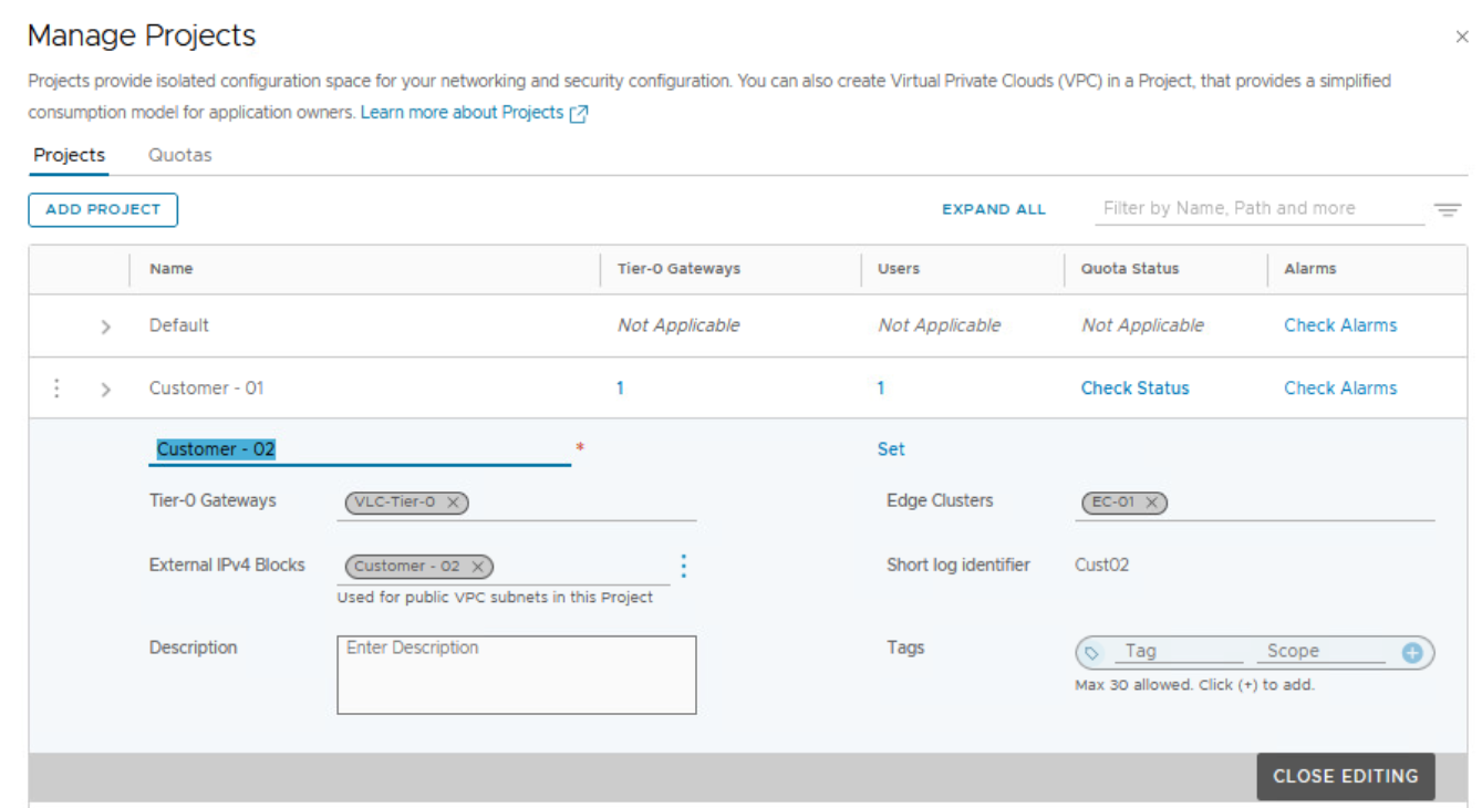 We can also create a NSX project and allocate a different NSX edge cluster to the new NSX project as shown below.