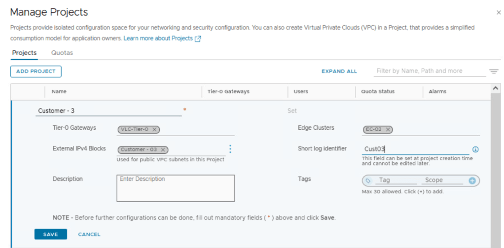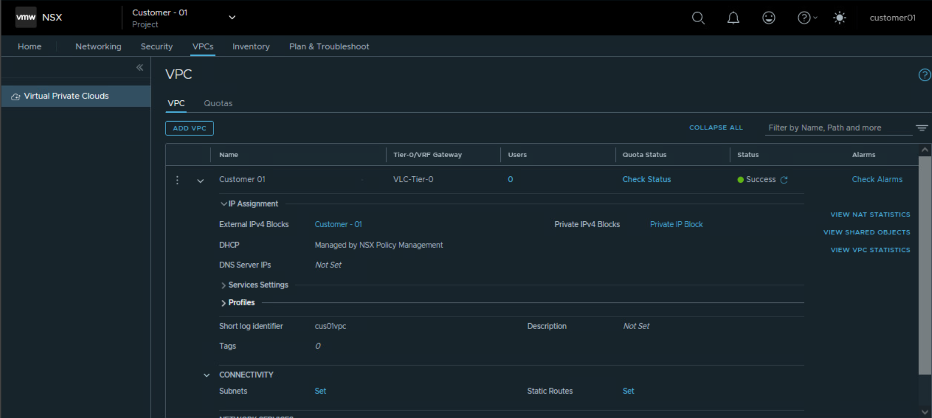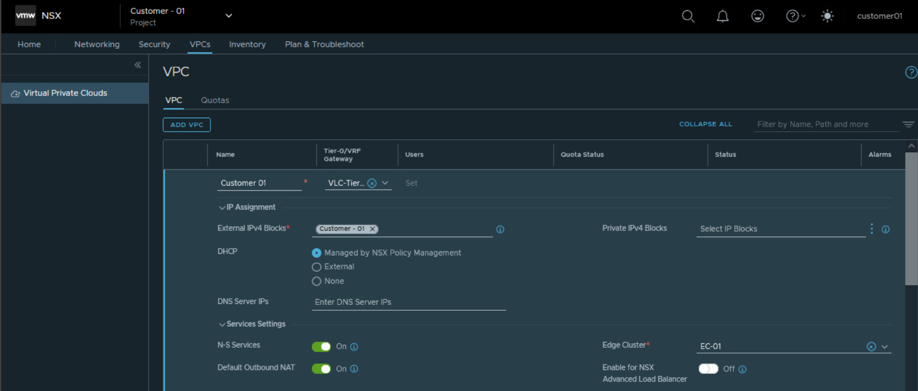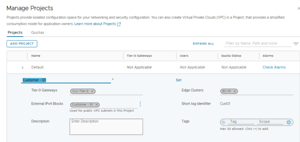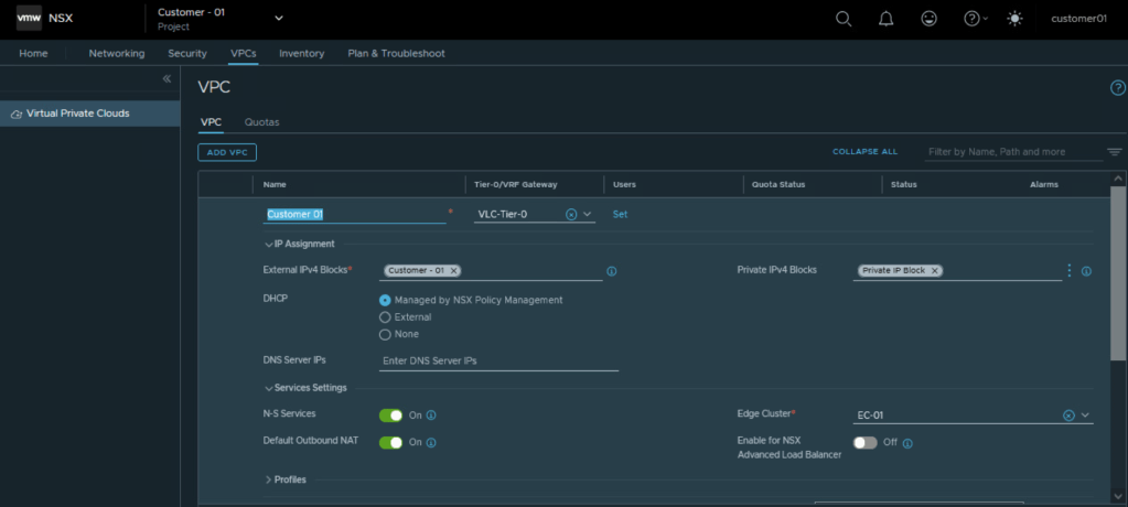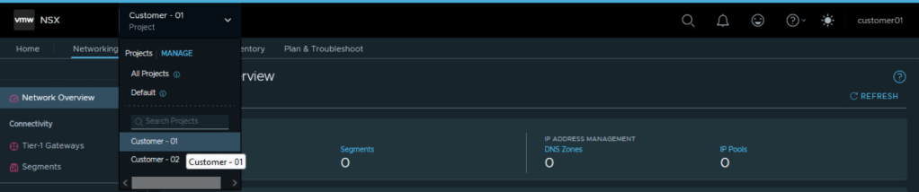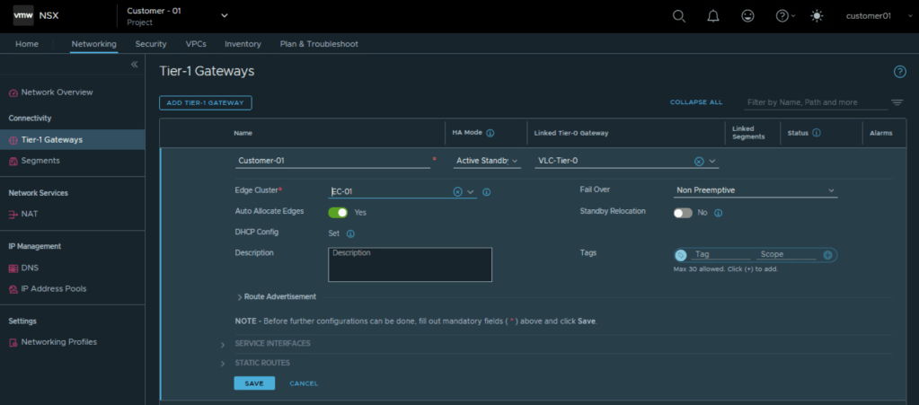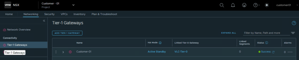 So we were able to configure Tier 1 Gateway under NSX project of Customer 01 and utilize the edge cluster and Tier 0 Gateway allocated to customer 01