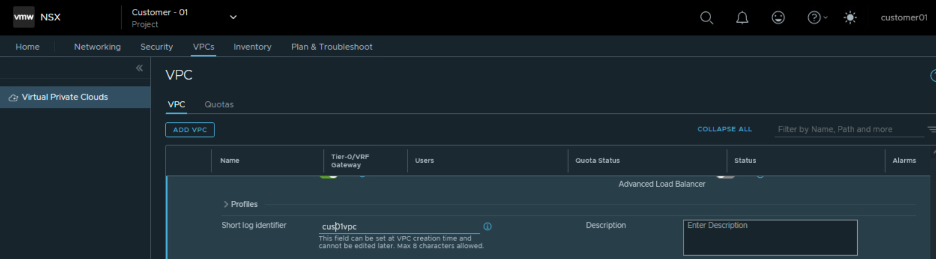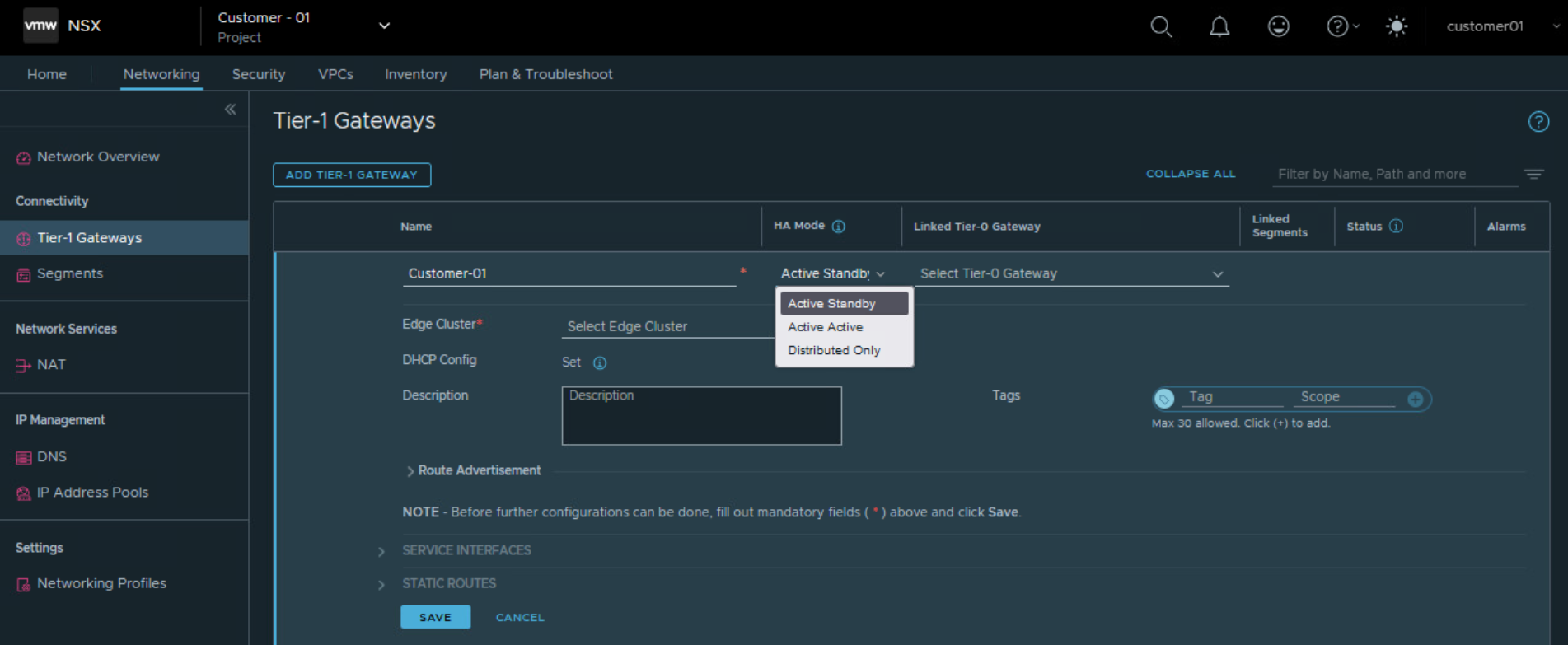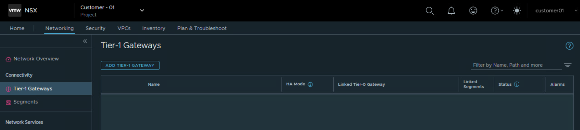 Choose Tier 0 Gateway assigned to the project for Customer 01.