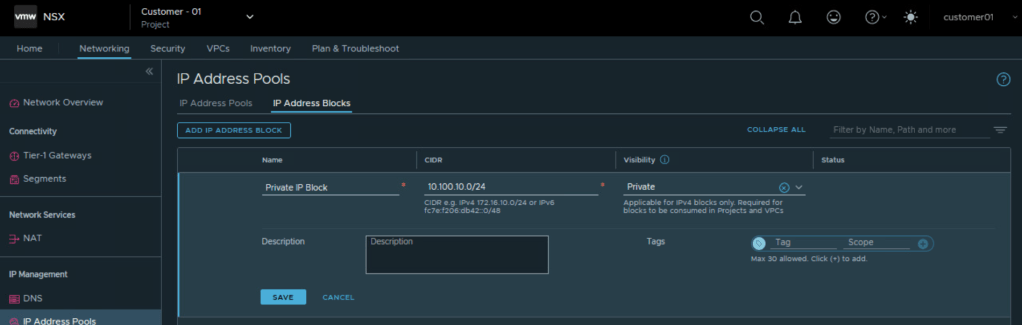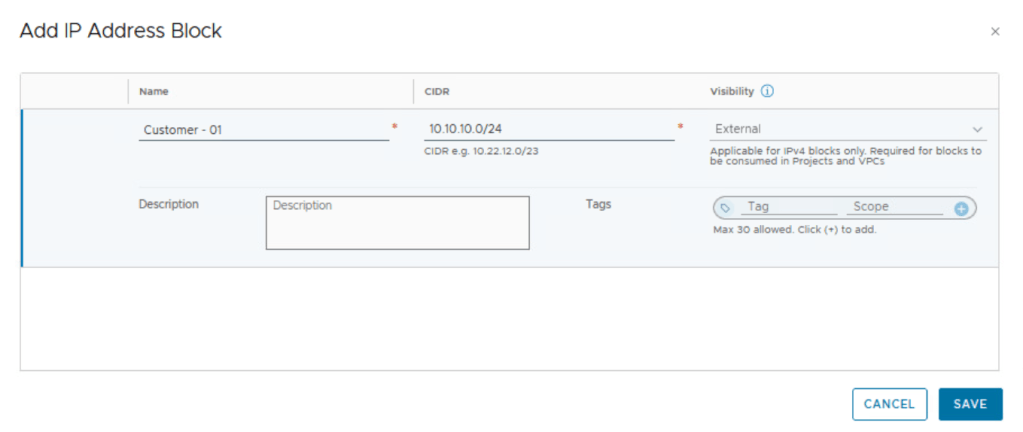 The selected IPv4 blocks will become available to you when you add public subnets in the NSX VPCs within the project. The system will assign CIDR blocks to the public subnets in the NSX VPCs from these external IPv4 blocks. We will discuss NSX VPC later in this blog.