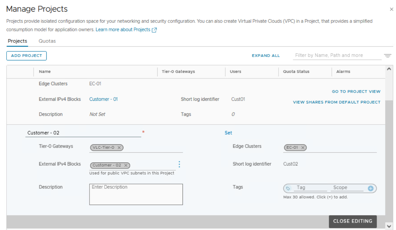 Notice we are able to use the same NSX edge cluster across two different NSX projects as shown below.