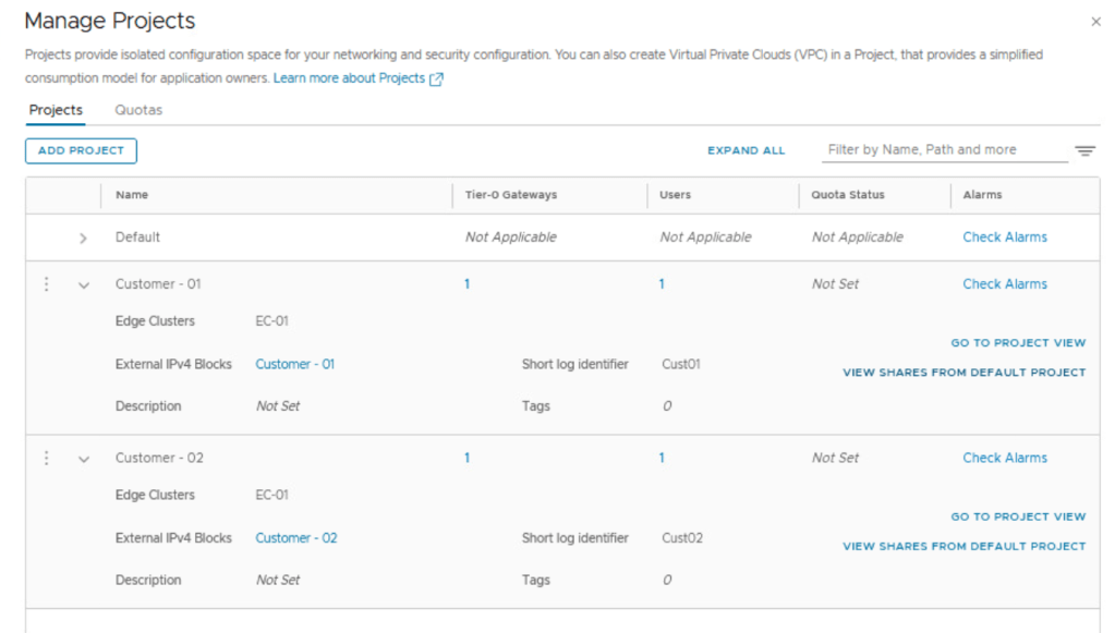 Each NSX project is equal to a tenant which could be a customer, a department or a line of business.
