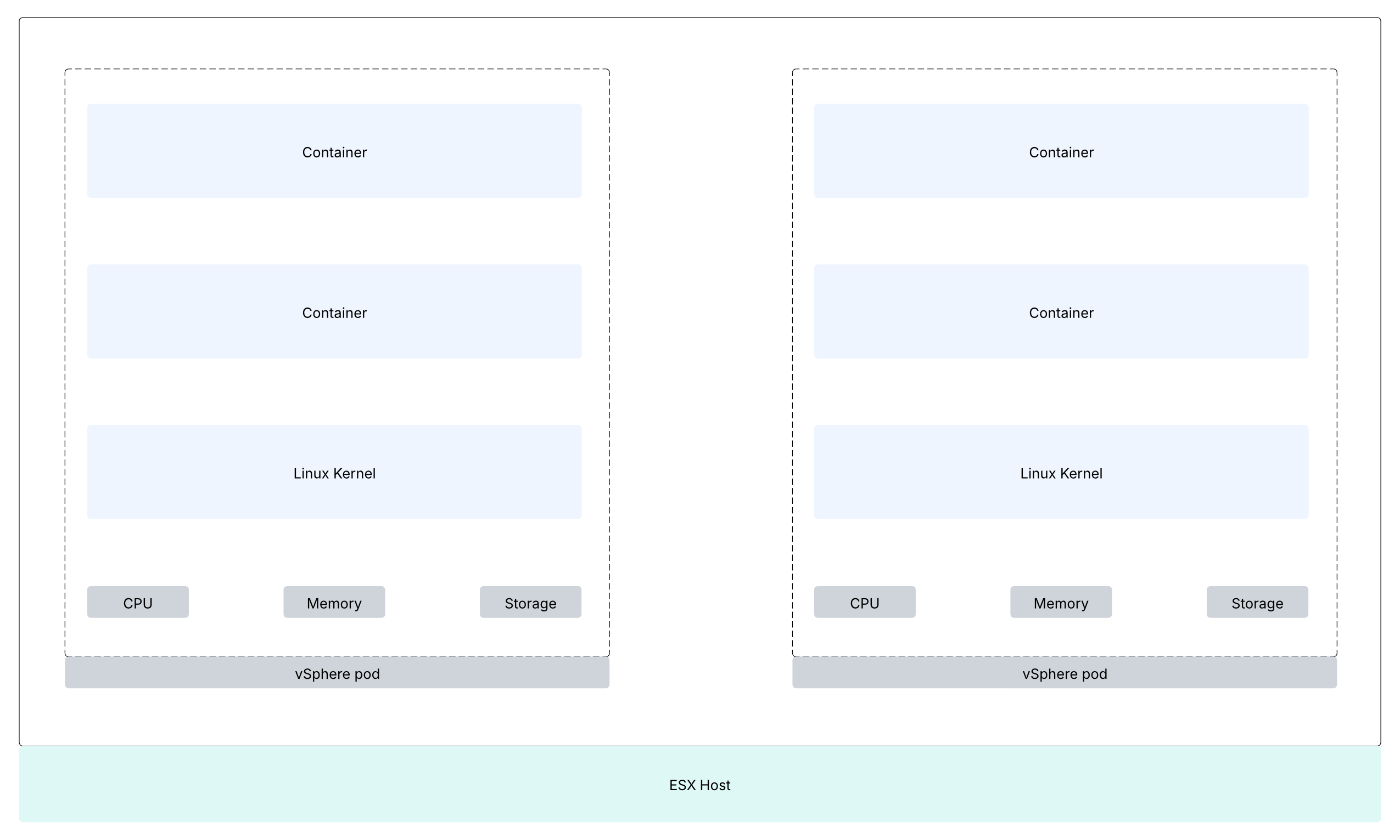 This construct is the equivalent of Kubernetes pod. A vSphere Pod is a VM with a small footprint that runs one or more Linux containers. Each vSphere Pod has its own unique Linux kernel. A vSphere Pod is isolated in the same manner as a virtual machine. vSphere Pods are only supported with Supervisors that are configured with NSX as the networking stack.