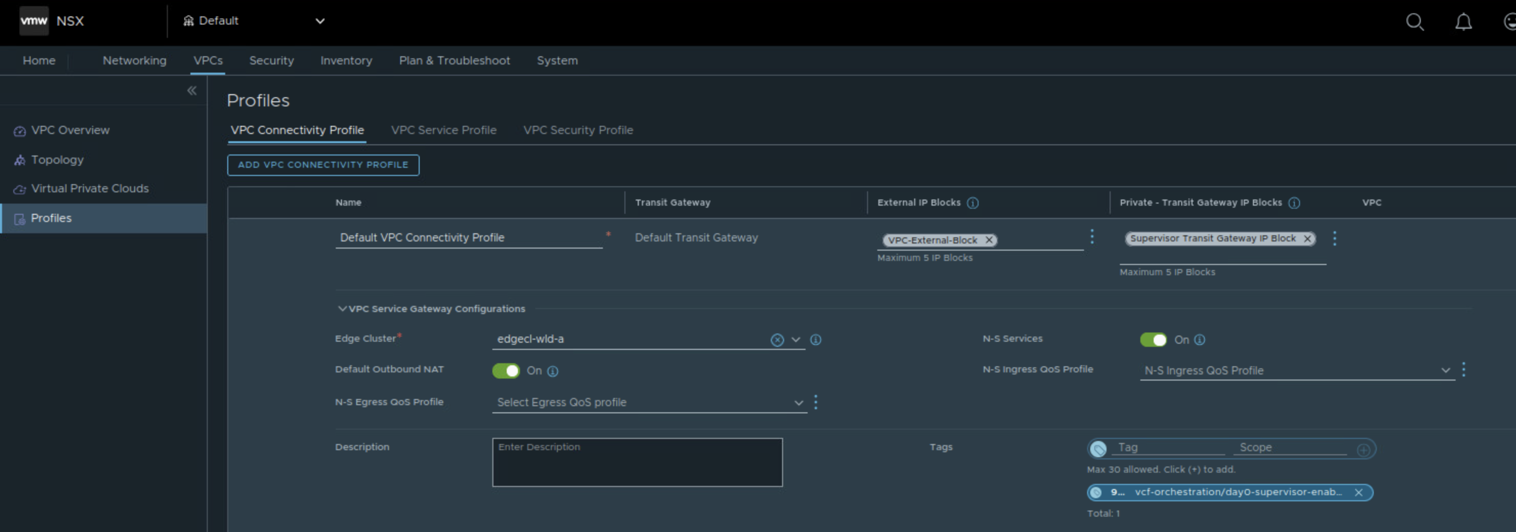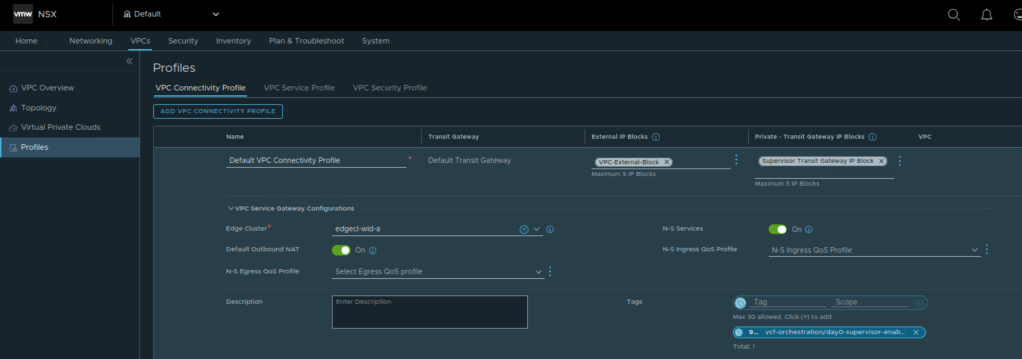 - NSX VPC connectivity profile, default VPC Connectivity profile can be used.