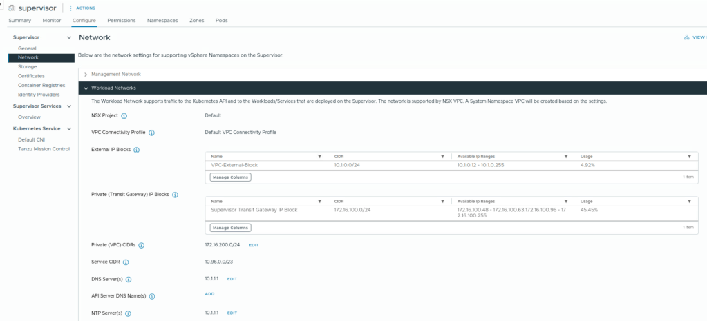 - Kubernetes services CIDR range: To assign IP addresses to Kubernetes services. You must specify a unique Kubernetes services CIDR range for each Supervisor.