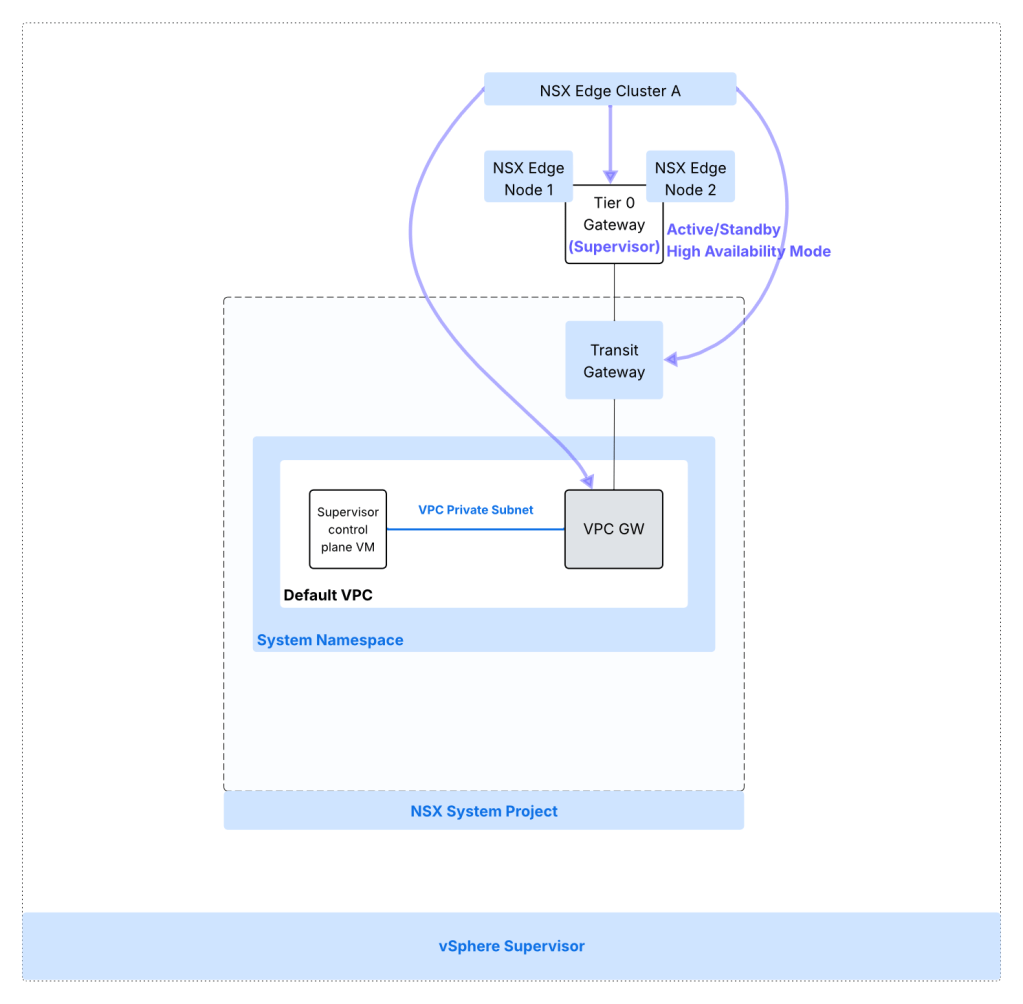 The architecture below is for vSphere Supervisor System Namespace with NSX VPC based networking.